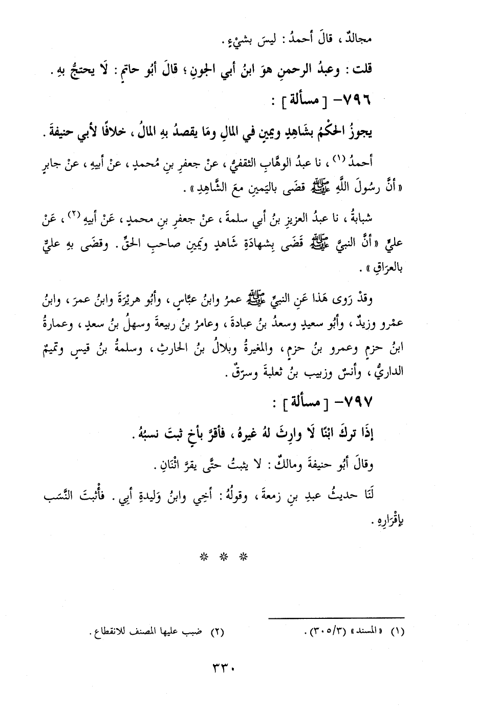 أَحْمد، نَا عبد الْوَهَّاب الثَّقَفِيّ، عَن جَعْفَر بن مُحَمَّد، عَن أَبِيه، عَن جَابر " أَن رَسُول الله [صلى الله عَلَيْهِ وَسلم] قضى بِالْيَمِينِ مَعَ الشَّاهِد ".