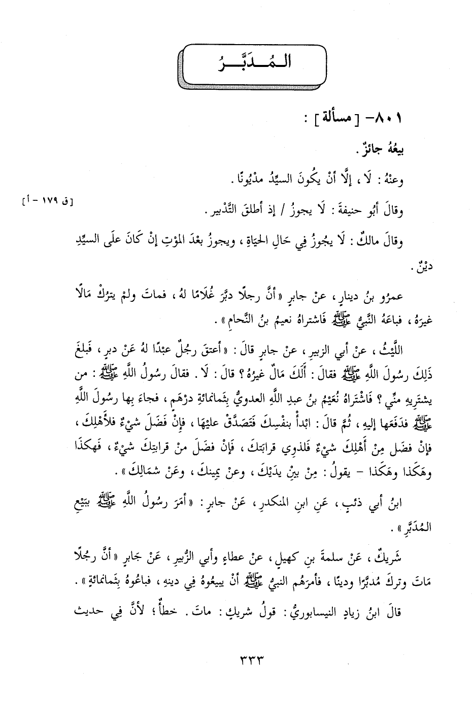 شريك، عَن سَلمَة بن كهيل، عَن عَطاء وَأبي الزبير، عَن جَابر " أَن رجلا مَاتَ وَترك مُدبرا وديناً، فَأَمرهمْ النَّبِي [صلى الله عَلَيْهِ وَسلم] أَن يبيعوه فِي دينه، فباعوه بثمانمائة ".