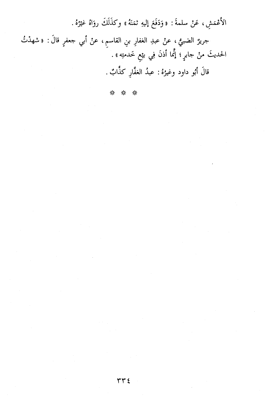 جرير الضَّبِّيّ، عَن عبد الْغفار بن الْقَاسِم، عَن أبي جَعْفَر قَالَ: " شهِدت الحَدِيث من جَابر؛ إِنَّمَا أذن فِي بيع خدمته ".
