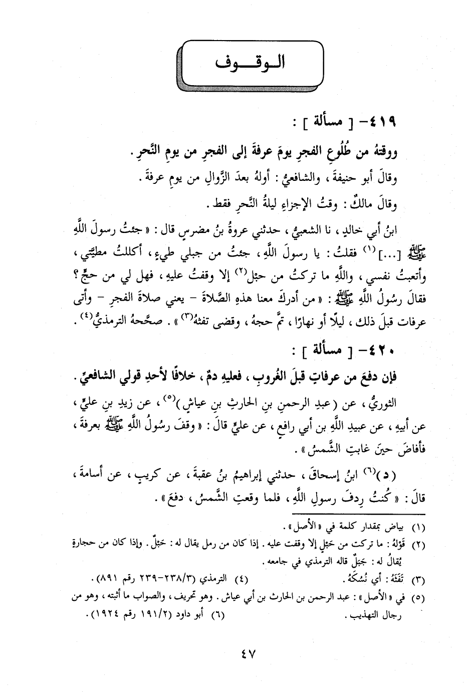 ابْن أبي خَالِد، نَا الشّعبِيّ، حَدثنِي عُرْوَة بن مُضرس قَالَ: " جِئْت رَسُول الله [صلى الله عَلَيْهِ وَسلم] [ ... .] فَقلت: يَا رَسُول الله، جِئْت من جبلى طَيء، أكللت مطيتي، وأتعبت نَفسِي، وَالله مَا تركت من حَبل إِلَّا وقفت عَلَيْهِ، فَهَل لي من حج؟ فَقَالَ رَسُول الله [صلى الله عَلَيْهِ وَسلم] : " من أدْرك هَذِه الصَّلَاة - يَعْنِي صَلَاة الْفجْر - وأتى عَرَفَات قبل ذَلِك، لَيْلًا أَو نَهَارا، تمّ حجه، وَقضى تفثه ". صَححهُ التِّرْمِذِيّ.