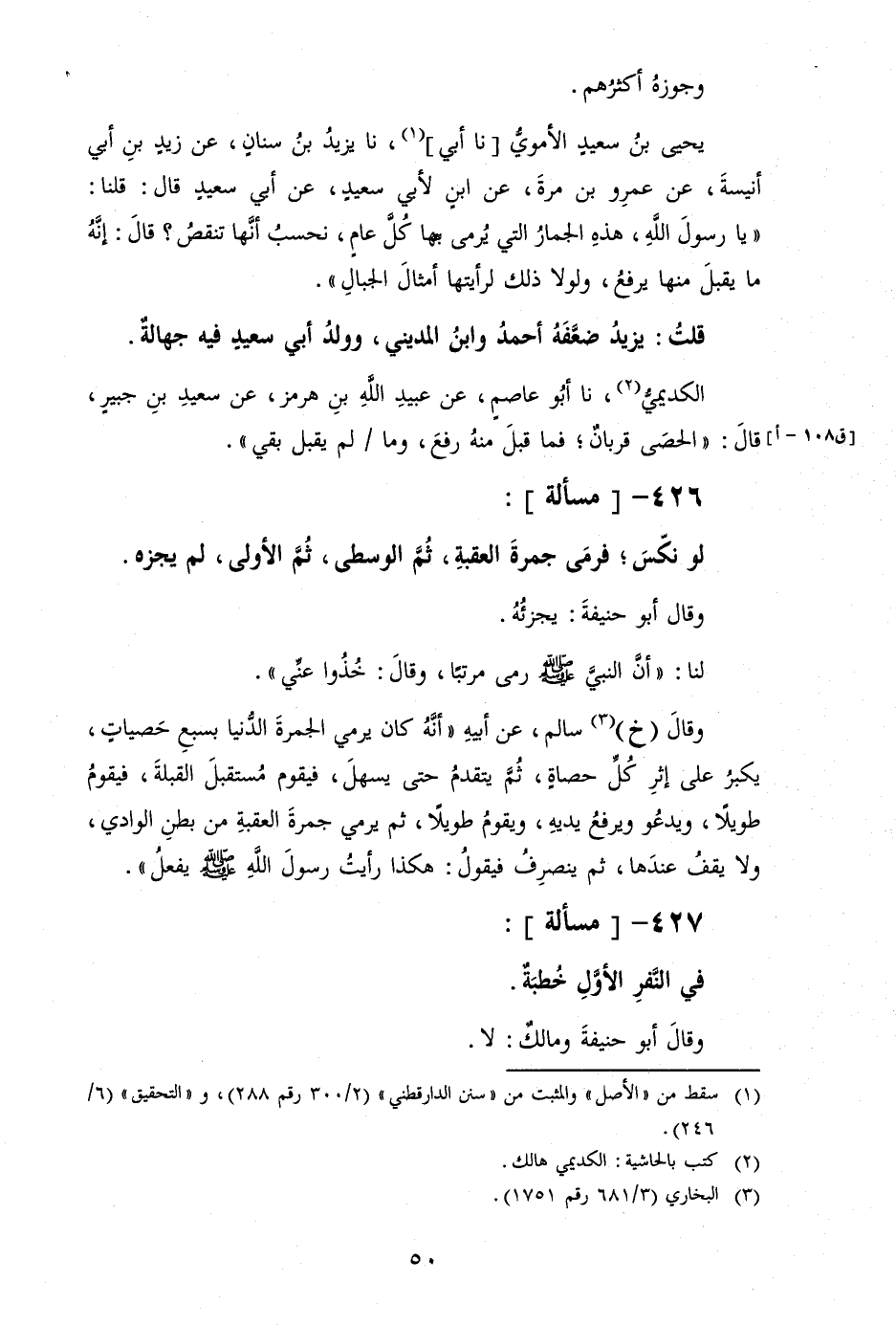 يحيى بن سعيد الْأمَوِي [نَا أبي] ، نَا يزِيد بن سِنَان، عَن زيد بن أبي أنيسَة، عَن عَمْرو بن مرّة، عَن ابْن لأبي سعيد، عَن أبي سعيد قَالَ: قُلْنَا: " يَا رَسُول الله، هَذِه الْجمار الَّتِي يرْمى بهَا كل عَام، نحسب أَنَّهَا تنقص؟ قَالَ: إِنَّه مَا يقبل مِنْهَا يرفع، وَلَوْلَا ذَلِك لرأيتها أَمْثَال الْجبَال ".