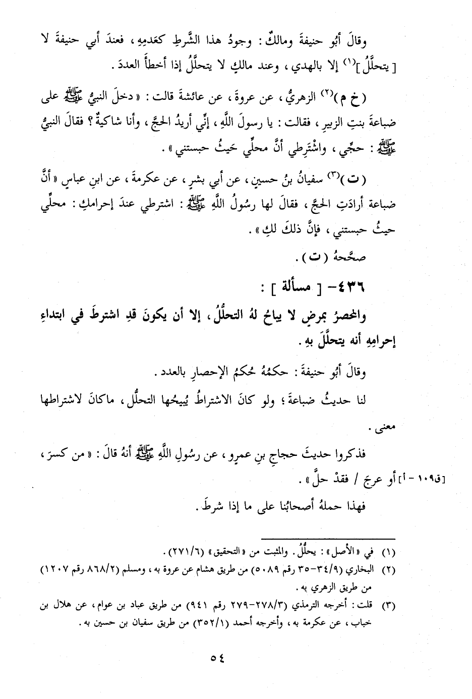 فَذكرُوا حَدِيث حجاج بن عَمْرو، عَن رَسُول الله [صلى الله عَلَيْهِ وَسلم] أَنه قَالَ: " من كسر، أَو عرج [ق 109 - أ] / فقد حل ".