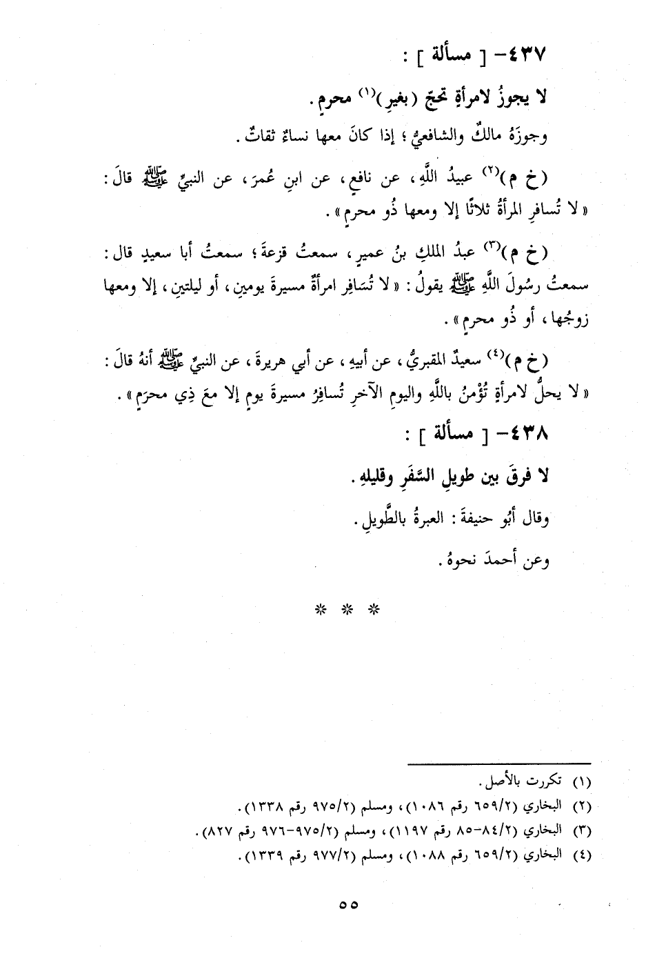 (خَ م) عبيد الله، عَن نَافِع، عَن ابْن عمر، عَن النَّبِي [صلى الله عَلَيْهِ وَسلم] قَالَ: " لَا تُسَافِر الْمَرْأَة ثَلَاثًا إِلَّا وَمَعَهَا ذُو محرم ".