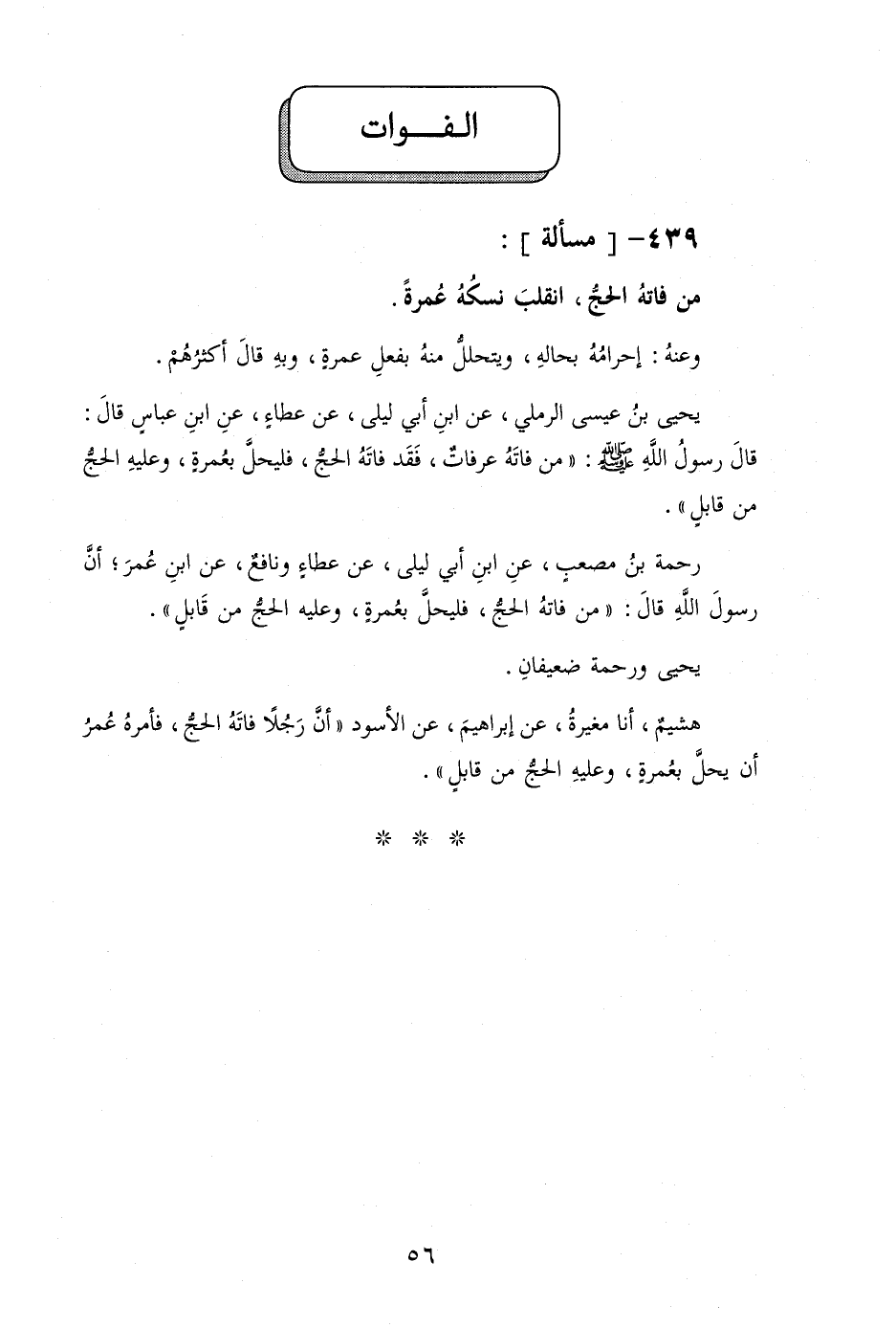 يحيى بن عِيسَى الرَّمْلِيّ، عَن ابْن أبي ليلى، عَن عَطاء، عَن ابْن عَبَّاس قَالَ: قَالَ رَسُول الله [صلى الله عَلَيْهِ وَسلم] : " من فَاتَهُ عَرَفَات، فقد فَاتَهُ الْحَج، فليحل بِعُمْرَة، وَعَلِيهِ الْحَج من قَابل ".