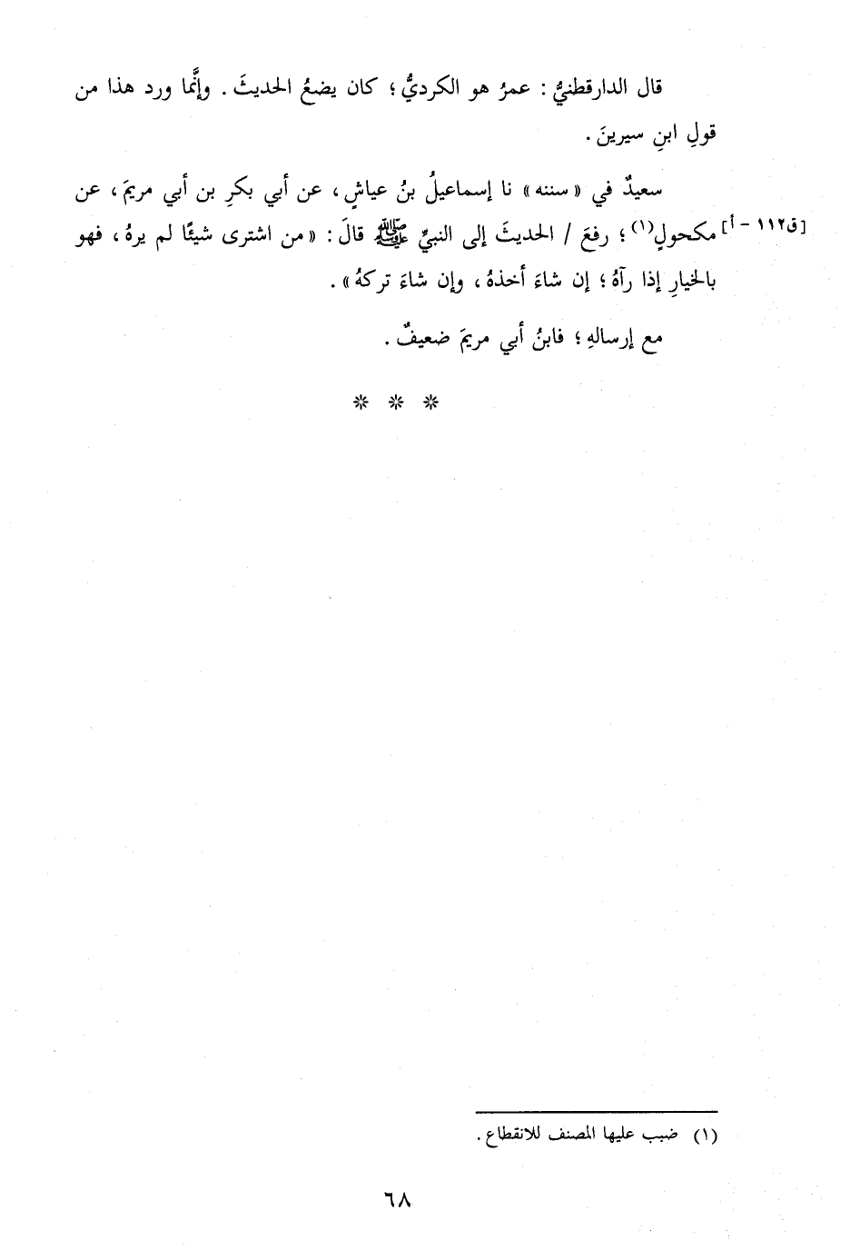 سعيد فِي " سنَنه " نَا إِسْمَاعِيل بن عَيَّاش، عَن أبي بكر بن أبي مَرْيَم، عَن مَكْحُول؛ رفع [ق 112 - أ] / الحَدِيث إِلَى النَّبِي [صلى الله عَلَيْهِ وَسلم] قَالَ: " من اشْترى شَيْئا لم يره، فَهُوَ بِالْخِيَارِ إِذا رَآهُ؛ إِن شَاءَ أَخذه، وَإِن شَاءَ تَركه ".