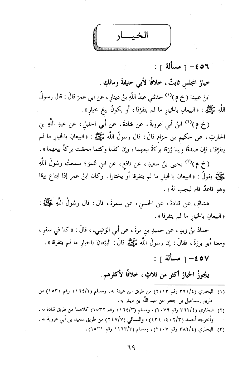 ابْن عَيْنِيَّة (خَ م) حَدثنِي عبد الله بن دِينَار، عَن ابْن عمر قَالَ: قَالَ رَسُول الله [صلى الله عَلَيْهِ وَسلم] : " البيعان بِالْخِيَارِ مَا لم يَتَفَرَّقَا، أَو يكون بيع خِيَار ".