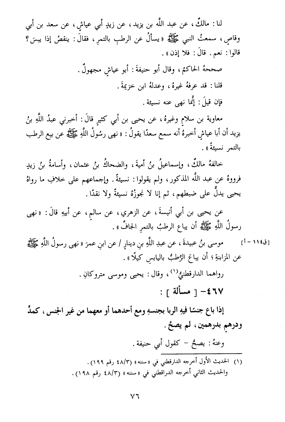 خَالفه مَالك، وَإِسْمَاعِيل بن أُميَّة، وَالضَّحَّاك بن عُثْمَان، وَأُسَامَة بن زيد فَرَوَوْه عَن عبد الله الْمَذْكُور، وَلم يَقُولُوا: نَسِيئَة. وإجماعهم على خلاف مَا رَوَاهُ يحيى يدل على ضبطهم، ثمَّ إِنَّا لَا نجوزه نَسِيئَة وَلَا نَقْدا.