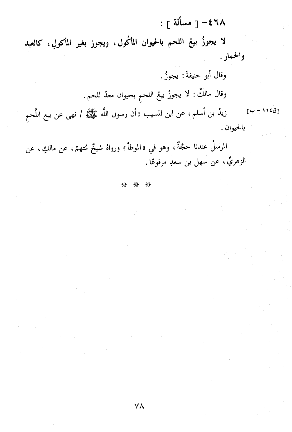 زيد بن أسلم، عَن ابْن الْمسيب " أَن رَسُول الله [صلى الله عَلَيْهِ وَسلم] [ق 114 - ب] / نهى عَن بيع اللحمِ بِالْحَيَوَانِ.