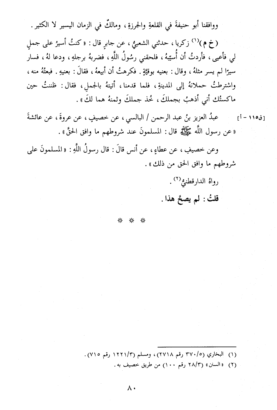 عبد الْعَزِيز بن عبد الرَّحْمَن [ق 115 - أ] / البالسي، عَن خصيف، عَن عُرْوَة، عَن عَائِشَة " عَن رَسُول الله [صلى الله عَلَيْهِ وَسلم] قَالَ: الْمُسلمُونَ عِنْد شروطهم مَا وَافق الْحق ".