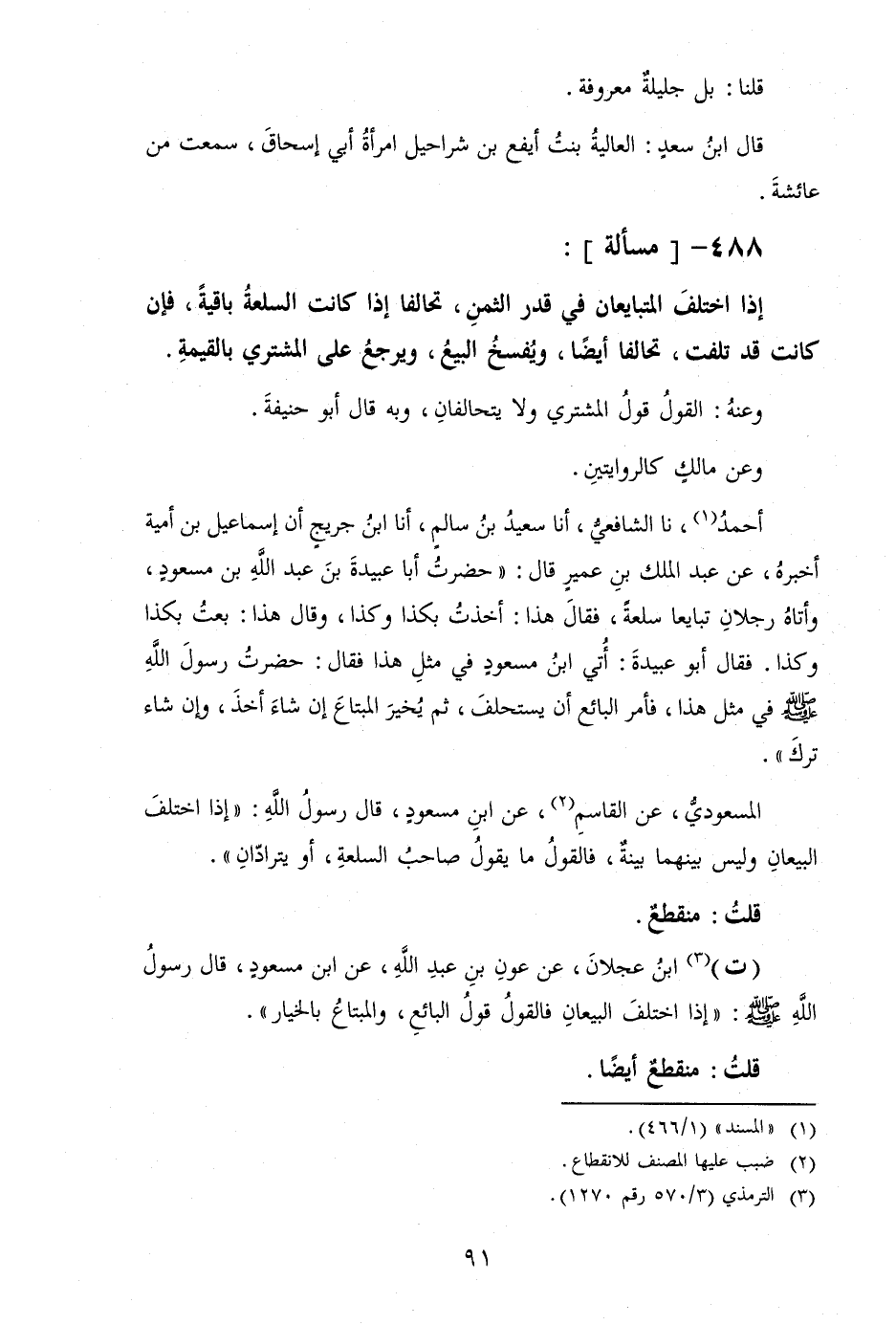 المَسْعُودِيّ، عَن الْقَاسِم، عَن ابْن مَسْعُود، قَالَ رسولُ الله: " إِذا اختلفَ البيعانِ وَلَيْسَ بَينهمَا بَيِّنَة، فَالْقَوْل مَا يَقُول صَاحب السّلْعَة، أَو يترادان ".
