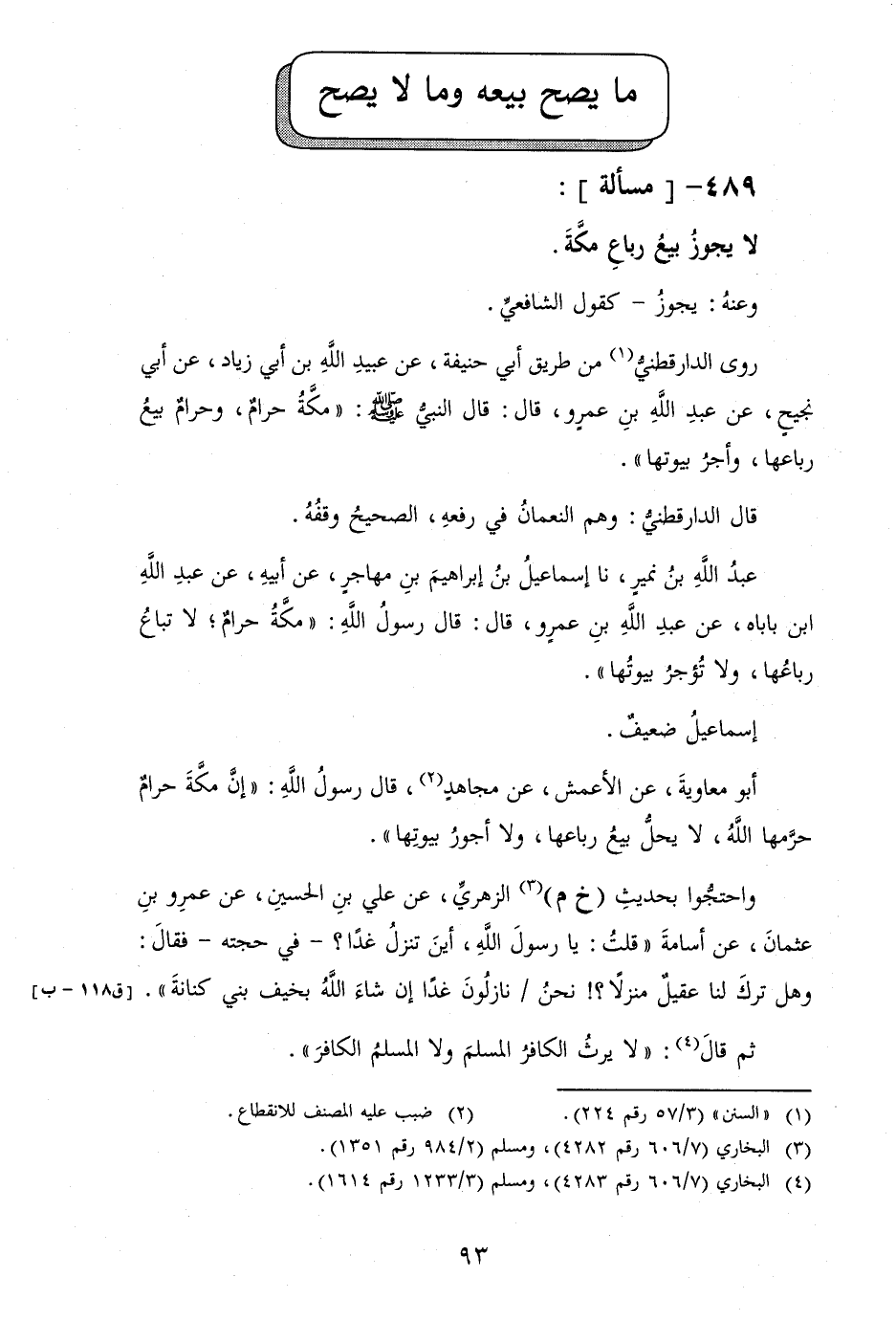 روى الدَّارَقُطْنِيّ من طَرِيق أبي حنيفَة، عَن عبيد الله بن أبي زِيَاد، عَن أبي نجيح، عَن عبد الله بن عَمْرو، قَالَ: قَالَ النَّبِي [صلى الله عَلَيْهِ وَسلم] : " مكةُ حرامٌ، وحرامٌ بيعُ رباعها، وَأجر بيوتها ".