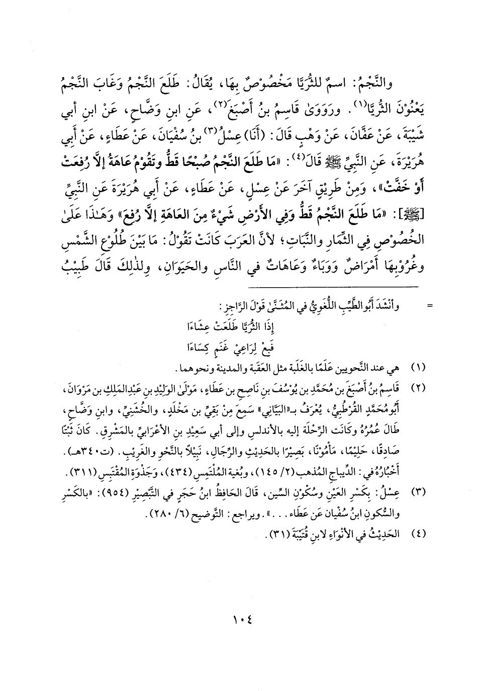 والنَّجْمُ: اسمٌ للثُّرَيَّا مَخصُوْصٌ بِهَا، يُقَالُ: طَلَعَ النَّجمُ وَغَابَ النَّجْمُ يَعْنُوْنَ الثُّريَّا (¬1). ورَوَوَى قَاسِمُ بنُ أَصْبَغَ (¬2)، عَنِ ابنِ وَضَّاحٍ، عَنْ ابنِ أبي شَيبَةَ، عَنْ عَفَّانَ، عَنْ وَهْبٍ قَال: (أَنَا) عِسْلُ (¬3) بنُ سُفْيَانَ، عَنْ عَطَاءٍ، عَنْ أَبِي هُرَيرَةَ، عَنِ النَّبِيِّ - صلى الله عليه وسلم - قال (¬4): "مَا طَلَعَ النَّجْمُ صُبْحًا قَطُّ وتَقُوْمُ عَاهَةُ إلَّا رُفِعَتْ أوْ خَفَّتْ"، وَمِنْ طَرِيقٍ آخَرَ عَنْ عِسْل، عَنْ عَطَاءٍ، عَنْ أَبِي هُرَيرَةَ عَنِ النَّبِيِّ - صلى الله عليه وسلم -: "مَا طَلَعَ النَّجْمُ قَطُّ وَفِي الأرضِ شَيءٌ مِنَ العَاهَةِ إلَّا رُفِع" وَهَذَا عَلَى الخُصُوْصِ في الثِّمَارِ والنَّبَاتِ؛ لأنَّ العَرَبَ كَانَتْ تَقُوْلُ: مَا بَينَ طُلُوع الشَّمْسِ وغُرُوْبِهَا أَمْرَاضٌ وَوَبَاء وَعَاهَاتٌ في النَّاسِ والحَيَوَانِ، ولذلِكَ قَال طَبِيبُ