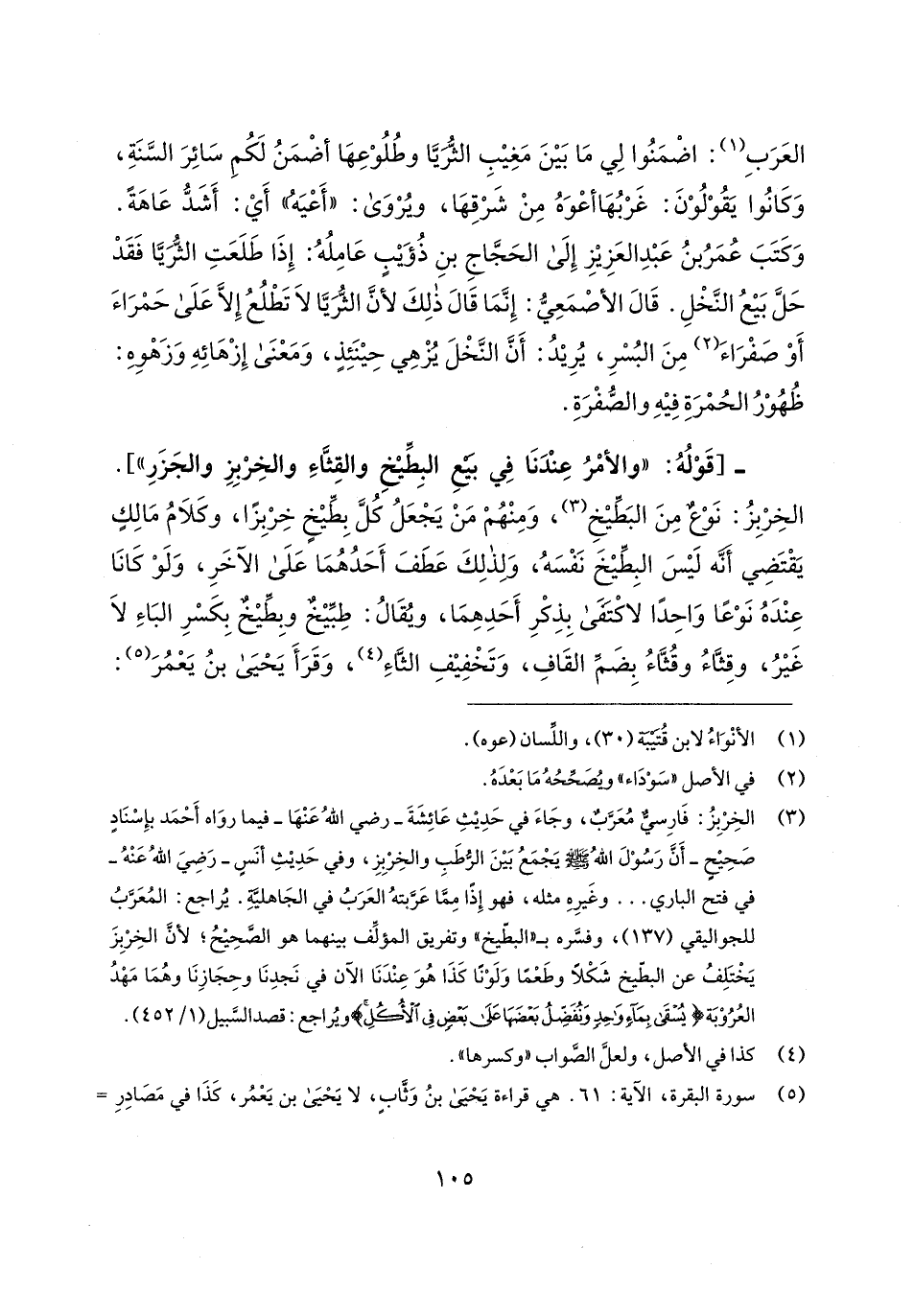 (¬3) الخِرْبِزُ: فَارِسيٌّ مُعَرَّبٌ، وجَاءَ في حَدِيثِ عَائِشَةَ - رضي اللهُ عَنْهَا - فيما روَاه أَحْمَد بإِسْنَادٍ صَحِيحٍ - أَنَّ رَسُوْلَ اللهُ - صلى الله عليه وسلم - يَجْمَعُ بَينَ الرُّطَبِ والخِرْبِزِ، وفي حَدِيثِ أنَسٍ- رَضِىَ اللهُ عَنْهُ- في فتح الباري ... وغَيرِهِ مثله، فهو إِذًا مِمَّا عَرَّبتهُ العَرَبُ في الجَاهليَّة. يُراجع: المُعَرَّبُ للجواليقي (137)، وفسَّره بـ"البطّيخ" وتفريق المؤلِّف بينهما هو الصَّحِيحُ؛ لأنَّ الخِرْبِزَ يَخْتَلِفُ عن البطّيخ شَكْلًا وطَعْمًا وَلَوْنًا كَذَا هُوَ عِنْدَنَا الآن في نَجدِنَا وحِجَازِنَا وهُمَا مَهْدُ العُروْبَة {يُسْقَى بِمَاءٍ وَاحِدٍ وَنُفَضِّلُ بَعْضَهَا عَلَى بَعْضٍ فِي الْأُكُلِ} ويُراجع: قصد السَّبيل (1/ 452).