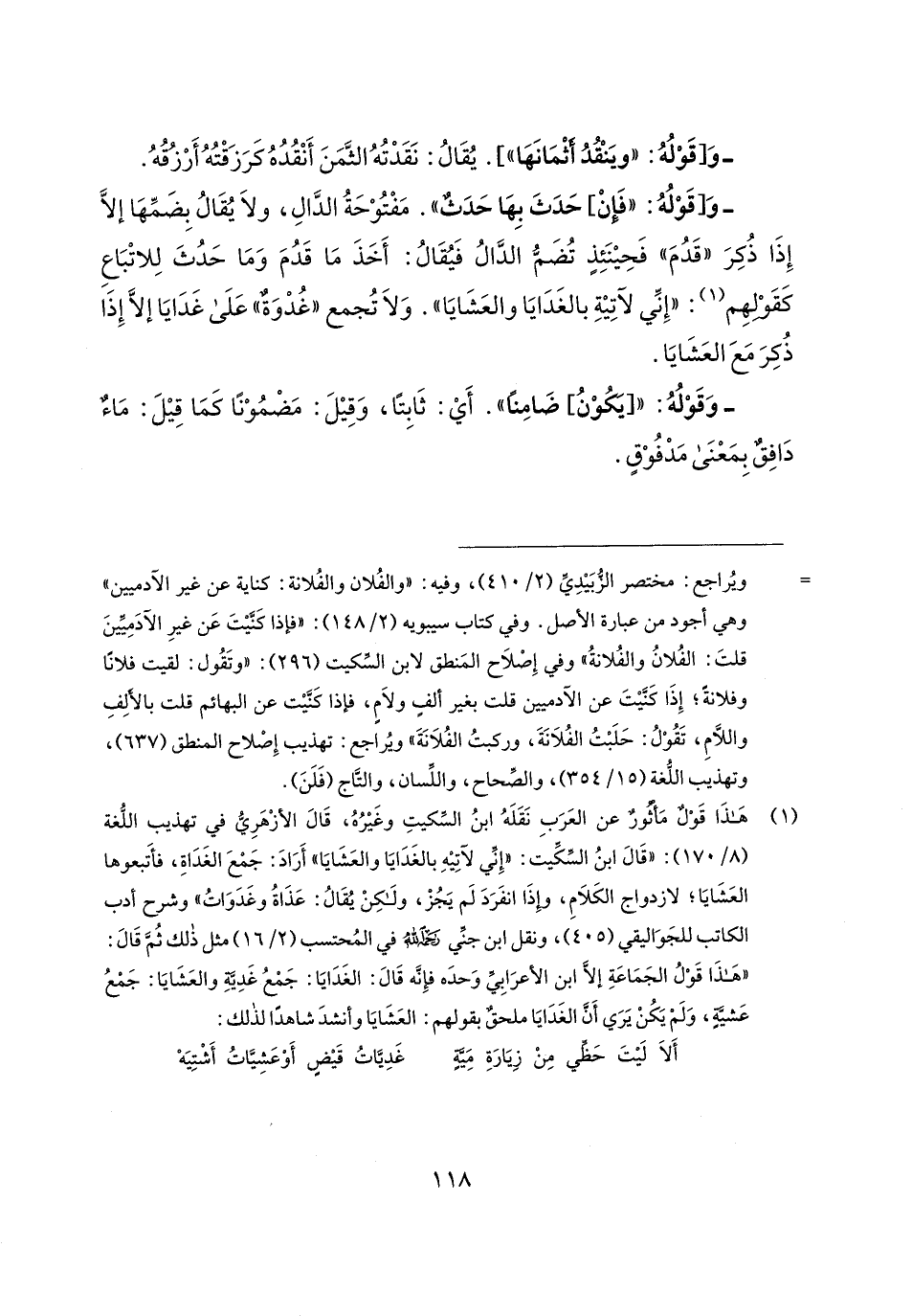 (¬1) هَذَا قَوْلٌ مَأثورٌ عن العَرَبِ نَقَلَهُ ابنُ السَّكيتِ وغَيرُهُ، قَال الأزْهَرِيُّ في تهذيب اللُّغة (8/ 170): "قَال ابنُ السِّكِّيت: "إِنِّي لآتِيهِ بالغَدَايَا والعَشَايَا" أَرَادَ: جَمْعَ الغَدَاةِ، فأَتبعوها العَشَايَا؛ لازدواج الكَلامِ، وإِذَا انفَرَدَ لَم يَجُزْ، ولكِنْ يُقَالُ: عَذاةُ وغَدَوَاتُ" وشرح أدب الكاتب للجَوَاليقي (405)، ونقل ابن جنِّي رحمه الله في المُحتسب (2/ 16) مثل ذلك ثُمَّ قَال: "هَذَا قَوْلُ الجَمَاعَةِ إلَّا ابن الأعرَابِي وَحدَه فإِنَه قَال: الغَدَايَا: جَمْعُ غَدِيَّةِ والعَشَايَا: جَمْعُ عَشيَّةٍ، وَلَمْ يَكُنْ يَرَي أَنَّ الغَدَايَا ملحقٌ بقولهم: العَشَايَا وأنشدَ شاهدًا لذلك: