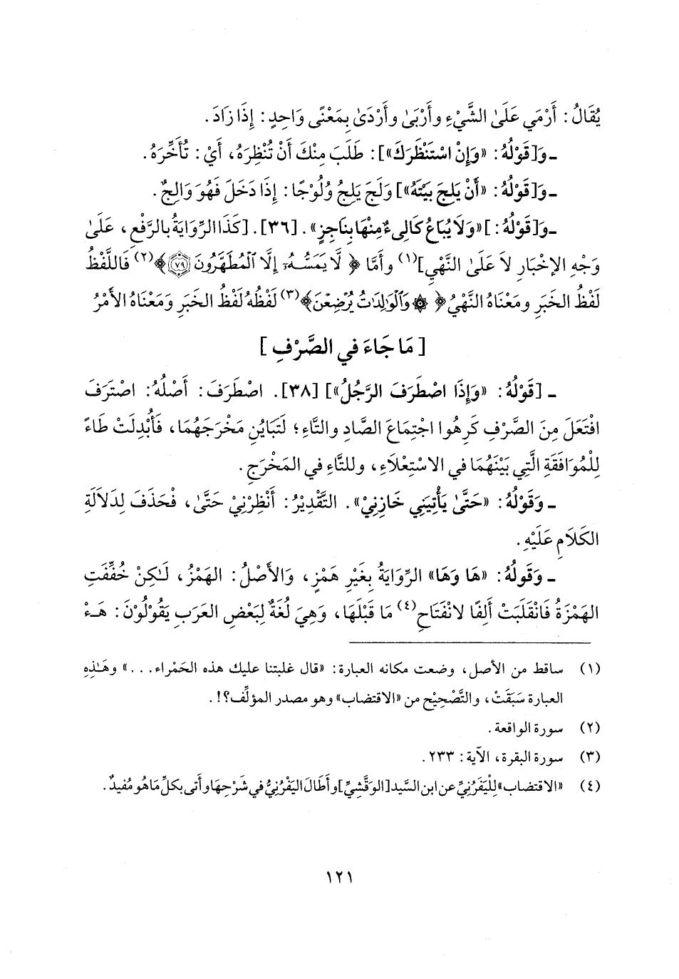 -[قَوْلُهُ: "وَإِذَا اصْطَرَفَ الرَّجُلُ"] [38]. اصْطَرَفَ: أَصْلُهُ: اصْتَرَفَ افْتَعَلَ مِنَ الصَّرْفِ كَرِهُوا اجْتِمَاعَ الصَّادِ والتَّاءِ؛ لَتبَايُنِ مَخْرَجَهُمَا، فَأبدِلَتْ طَاءً لِلْمُوَافَقَةِ الَّتِي بَينَهُمَا في الاسْتِعْلاءِ، وللتَّاءِ في المَخْرَجِ.