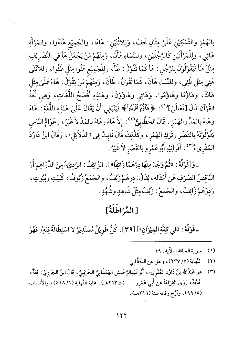 بالهَمْزِ والتَّسْكِينِ عَلَى مِثَالِ خَفْ، وَلِلاثْنَينِ: هَاءَا، والجَمِيع هَاءُوا، والمَرْأَةِ هَائِي، ولِلْمَرْأتينِ كَالرَّجُلَينِ، وللنِّسَاءِ هَأْنَ، وَمِنْهُمْ مَنْ يَجْعَلُ هَأ في التَّصْرِيفِ مِثْلَ طَأ فَيقُوْلُوْنَ لِلرَّجُلِ: هَأ كَمَا تَقُوْلُ: طَأْ، ولِلْجَمِيع هَئُوا مِثْلِ طَئُوا، وللأنْثَى هَئِي مِثْل طَئِي، وللنَسَاءِ هَأْنَ، كَمَا تَقُوْلُ: طَأْنَ، وَمِنْهُمْ مَنْ يَقُوْلُ: هَاءَ عَلَى مِثْلِ هَاكَ، وهَاؤُمَا وهَاؤُمُوا، وَهَائِي وهَاؤُوْنَ، وهَذ أَفْصَحُ اللُّغَاتِ، وَهِي لُغَةُ القُرْآن قَال [تَعَالى] (¬1): {هَاؤُمُ اقْرَءُوا} فَيَنْبَغِي أَنْ يُقَال عَلَى هَذِهِ اللُّغَةِ: هَاءَ وهَاءَ بالمَدِّ والهَمْزِ. قَال الخَطَّابِيُّ (¬2): إِلَّا هَاءَ وهَاءَ بالمَدِّ لَا غَيرُ، وعوَامُّ النَّاسِ يَقُوْلُوْنَهُ بالقَصْرِ وتَرْكِ الهَمْزِ، وكَذلِكَ قَال ثَابِتٌ في "الدَّلائِلِ"، وَقَال ابنُ دَاوُدَ المُقْرِئُ (¬3): أَقَرأنِيهِ أَبُو عَمْرٍو بالقَصْرِ لَا غَيرُ.