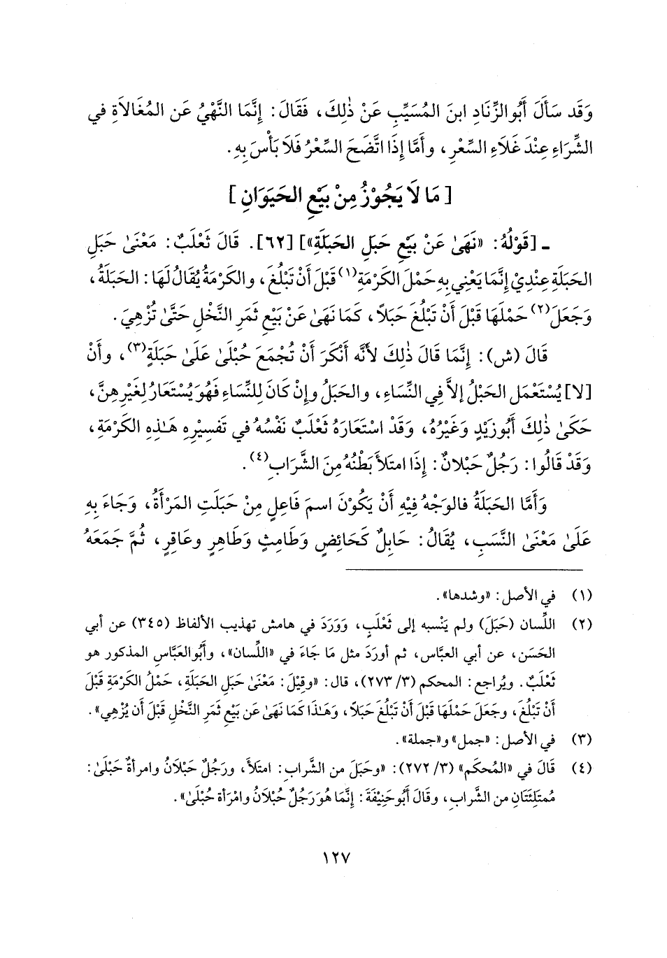 (¬2) اللِّسان (حَبَلَ) ولم يَنْسبه إلى ثَعْلَبٍ، وَوَرَدَ في هامش تهذيب الألفاظ (345) عن أبي الحَسَن، عن أبي العبَّاس، ثم أورَدَ مثل مَا جَاءَ في "اللِّسان"، وأَبُو العَبَّاسِ المذكور هو ثَعْلَبٌ. ويُراجع: المحكم (3/ 273)، قال: "وقِيلَ: مَعْنَى حَبَلِ الحَبَلَةِ، حَمْلُ الكَرْمَةِ قَبْلَ أَنْ تَبْلُغَ، وجَعَلَ حَمْلَهَا قَبْل أَنْ تَبْلُغَ حَبَلًا، وَهَذَا كَمَا نَهَى عَن بَيع ثَمَرِ النَّخْلِ قَبْلَ أَن يُزْهِي".