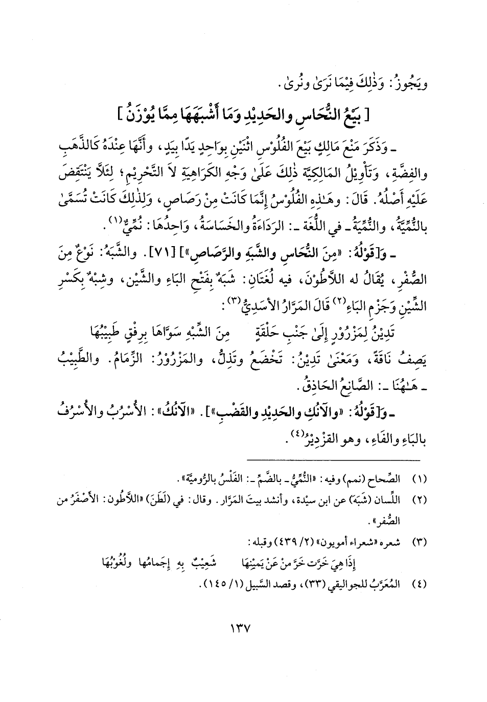 - وَ [قَوْلُهُ: "مِنَ النُّحَاسِ والشَّبَهِ والرَّصَاصِ"] [71]. والشَّبَهُ: نَوْعٌ مِنَ الصُّفْرِ، يُقَالُ له اللَّاطُوْنَ، فيه لُغَتَانِ: شَبَهٌ بِفَتْحِ البَاءِ والشَّين، وشِبْهٌ بِكَسْرِ الشِّينِ وَجَزْمِ البَاءِ (¬2) قَال المَرَّارُ الأسَدِيُّ (¬3):