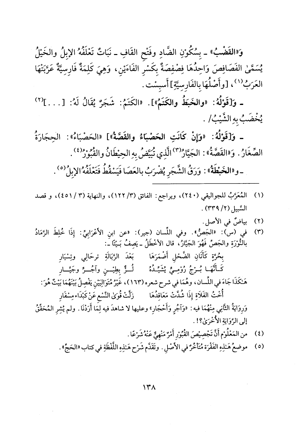 وَ"القَضْبُ" -بِسُكُوْنِ الضَّادِ وفَتْحِ القَافِ- نَبَاتٌ تَعْلَفُهُ الإبِلُ والخَيلُ يُسَمَّى الفَصَافِصَ وَاحِدُهَا فِصْفِصَةٌ بِكَسْرِ الفَاءَينِ، وَهِيَ كَلِمَةٌ فَارِسِيَّةٌ عَرَّبَتْهَا العَرَبُ (¬1)، [وأَصْلُهَا بِالفَارِسِيَّةِ] أَسبِسْت.