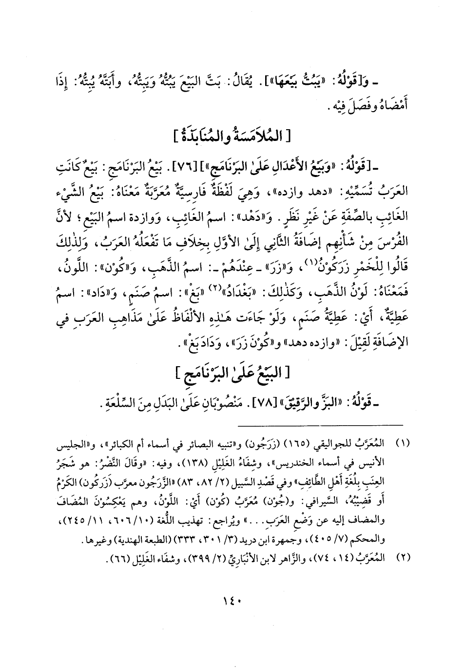 -[قَوْلُهُ: "وَبَيعُ الأَعْدَالِ عَلَى البَرْنَامَجِ"، [76]. بَيعُ البَرْنَامَجِ: بَيعٌ كَانَتِ العَرَبُ تُسَمِّيهِ: "دهد وازده"، وَهِيَ لَفْظَةٌ فَارِسِيَّةٌ مُعَرَّبَةٌ مَعْنَاهُ: بَيعُ الشَّيء الغَائِبِ بالصِّفَةِ عَنْ غَيرِ نَظَرٍ. وَ "دَهْد": اسمُ الغَائِبِ، وَوازدة اسمُ البَيع؛ لأنَّ الفُرْسَ مِنْ شَأْنِهِم إضَافَةُ الثَّانِي إِلَى الأوَّلِ بِخِلافِ مَا تَفْعَلُهُ العَرَبُ، وَلِذلِكَ قَالُوا لِلْخَمْرِ زَرَكُوْنُ (¬1)، وَ "زَرَ" -عِنْدَهُمْ-: اسمُ الذَّهَبِ، وَ "كُوْن": اللَّونُ، فَمَعْنَاهُ: لَوْنُ الذَّهَبِ، وَكَذلِكَ: "بَغْدَادُ" (¬2) "بَغْ": اسمُ صَنَمٍ، وَ"دَاد": اسمُ عَطِيَّةٌ، أَي: عَطِيَّةُ صَنَمٍ، وَلَوْ جَاءَت هَذ الألْفَاظُ عَلَى مَذَاهِبِ العَرَبِ في الإضَافَةِ لَقِيلَ: "وازده دهد" و"كُوْنَ زَرَ"، وَدَادَ بَغْ".
