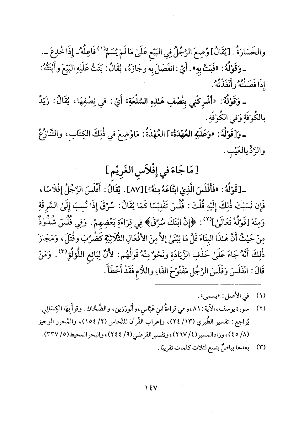 -[قَوْلُهُ: "فَأَفْلَسَ الَّذِي ابْتَاعَهُ مِنْهُ"] [87]. يُقَالُ: أَفْلَسَ الرَّجُلُ إِفْلاسًا، فَإِن نَسَبْتَ ذلِكَ إِلَيهِ قُلْتَ: فُلَّسَ تَفْلِيسًا كَمَا يُقَالُ: سُرِّقَ إِذَا نُسِبَ إِلَى السَّرِقَةِ وَمِنْهُ [قَوْلُهُ تَعَالى] (¬2): {إِنَّ ابْنَكَ سَرَقَ} فِي قِرَاءَةِ بَعْضِهِمْ. وَفِي فُلِّسَ شُذُوْذٌ مِنْ حَيثُ أَنَّ هَذَا البِنَاءَ قَلَّ مَا يُبْنَى إلَّا مِنَ الأفْعَالِ الثُّلاثِيَّةِ كَضُرِّبَ وقُتّلَ، وَمَجَازَ ذلِكَ أَنَّهُ جَاءَ عَلَى حَذْفِ الزِّيَادَةِ ونَحْوٌ مِنْهُ قَوْلُهُم: لأَلٌ لِبَائِعِ اللُّؤلُؤِ (¬3). وَمَنْ قَال: انْفَلَسَ وَفَلَسَ الرَّجُل مَفْتُوْحَ الفَاءِ واللَّامِ فَقَدْ أَخْطَأَ.