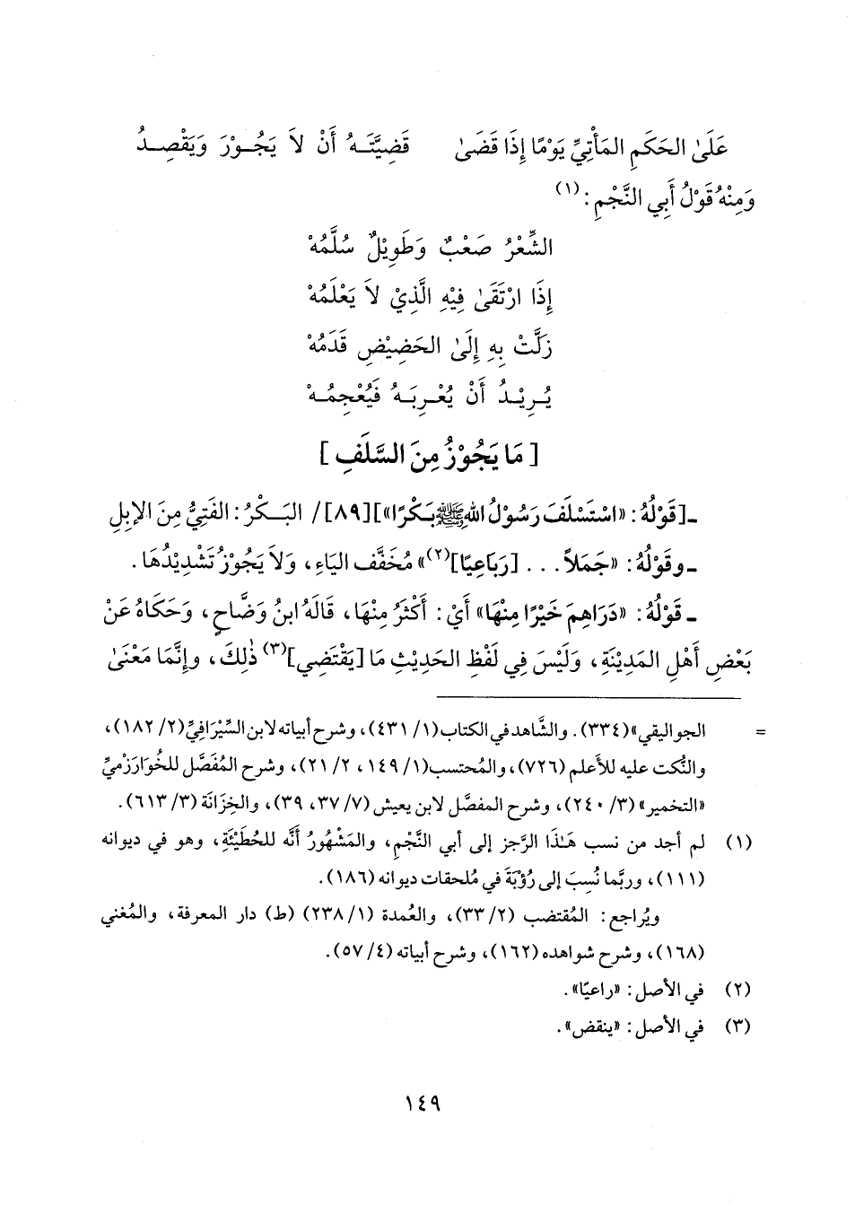 = الجواليقي" (334). والشَّاهد في الكتاب (1/ 431)، وشرح أبياته لابن السِّيرَافِيِّ (2/ 182)، والنُّكت عليه للأَعلم (726)، والمُحتسب (1/ 149، 2/ 21)، وشرح المُفَصَّل للخُوَارَزْميِّ "التخمير" (3/ 240)، وشرح المفصَّل لابن يعيش (7/ 37، 39)، والخِزَانَة (3/ 613).