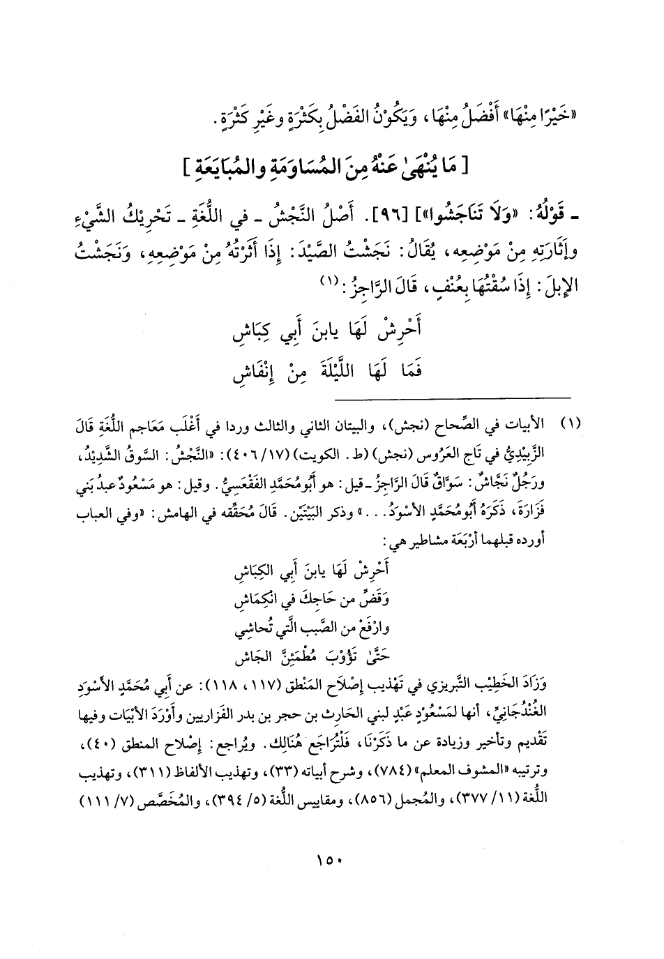 - قَوْلُهُ، "وَلَا تَنَاجَشُوا"] [96]. أَصْلُ النَّجْشُ -في اللُّغَةِ- تَحْرِيكُ الشَّيءِ وإثَارَتِهِ مِنْ مَوْضِعِه، يُقَالُ: نَجَشْتُ الصَّيدَ: إِذَا أَثَرْتُهُ مِنْ مَوْضِعِهِ، وَنَجَشْتُ الإبلَ: إِذَا سُقْتُهَا بِعُنْفٍ، قَال الرَّاجِزُ: (¬1)