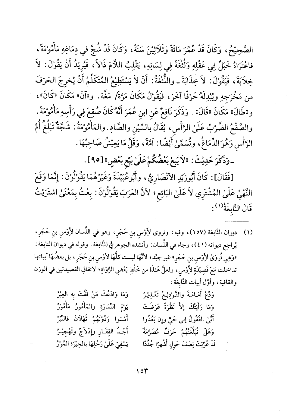 الصَّحِيحُ، وَكَانَ قَدْ عُمِّرَ مَائَةً وَثَلاثِينَ سَنَةً، وَكَانَ قَدْ شُجَّ في دِمَاغِهِ مَأْمُوْمَةً، فاعْتَرَاهُ خَبَلٌ فِي عَقْلِهِ وَلُثْغَةً فِي لِسَانِهِ، يَقْلِبُ اللَّامَ ذَالًا، فَيُرِيدُ أَنْ يَقُوْلَ: لَا خِلابَةَ، فَيَقُوْلَ: لَا خِذَابَةَ -واللُّثْغَةُ: أَنْ لَا يَسْتَطِيعُ المُتَكَلِّمُ أَنْ يُخْرِجَ الحَرْفَ من مَخْرَجِهِ ويُبْدِلَهُ حَرْفًا آخَرَ، فَيَقُوْلُ مَكَانَ مَرَّةَ مَغَّة. و"آنَ" مَكَانَ "كَانَ"، و"طَال" مَكَانَ "قَال". وَذَكَرَ نَافِعٌ عَنِ ابنِ عُمَرَ أَنَّهُ كَانَ صُقِعَ فِي رَأْسِهِ مَأْمُوْمَةً. والصَّقْعُ الضَّرْبُ عَلَى الرَّأْسِ، يُقَالُ بالسِّينِ والصَّادِ. والمَأْمُوْمَةُ: شَجَّةٌ تَبْلُغُ أُمَّ الرَّأْسِ وَهُوَ الدِّمَاغُ، وتُسَمَّى أَيضًا: آمَّةً، وَقَلَّ مَا يَعِيشُ صَاحِبُهَا.