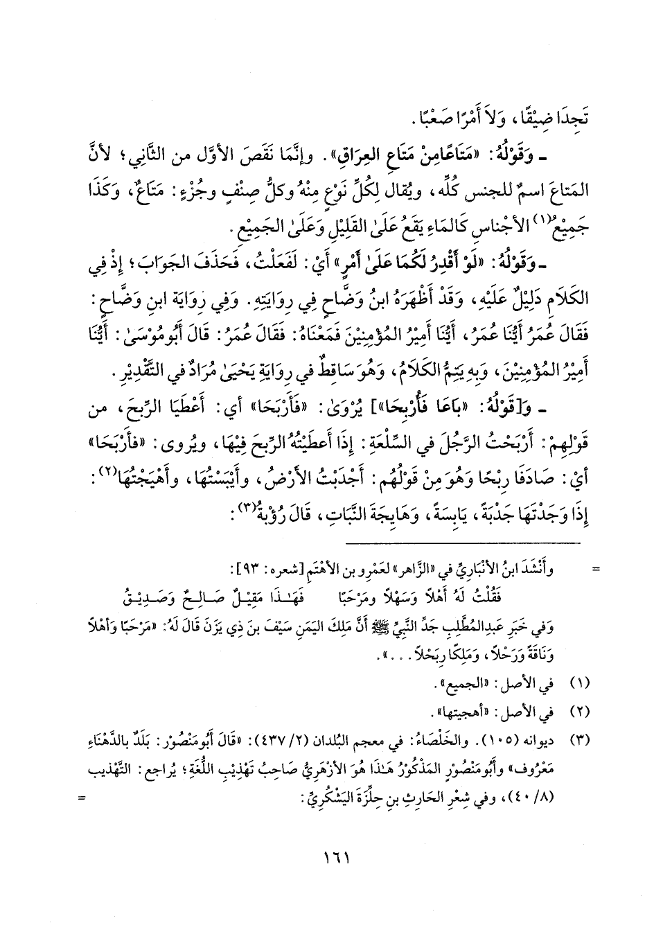 - وَقَوْلُهُ: "مَتَاعًا مِنْ مَتَاعِ العِرَاقِ". وإنَّمَا نَقَصَ الأوَّل من الثَّانِي؛ لأنَّ المَتاعَ اسمٌ للجنس كُلِّه، ويُقال لِكُلِّ نَوْعٍ مِنْهُ وكلُّ صِنْفٍ وجُزْءٍ: مَتَاعٌ، وَكَذَا جَمِيعُ (¬1) الأجْناسِ كَالمَاءِ يَقَعُ عَلَى القَلِيلِ وَعَلَى الجَمِيعِ.