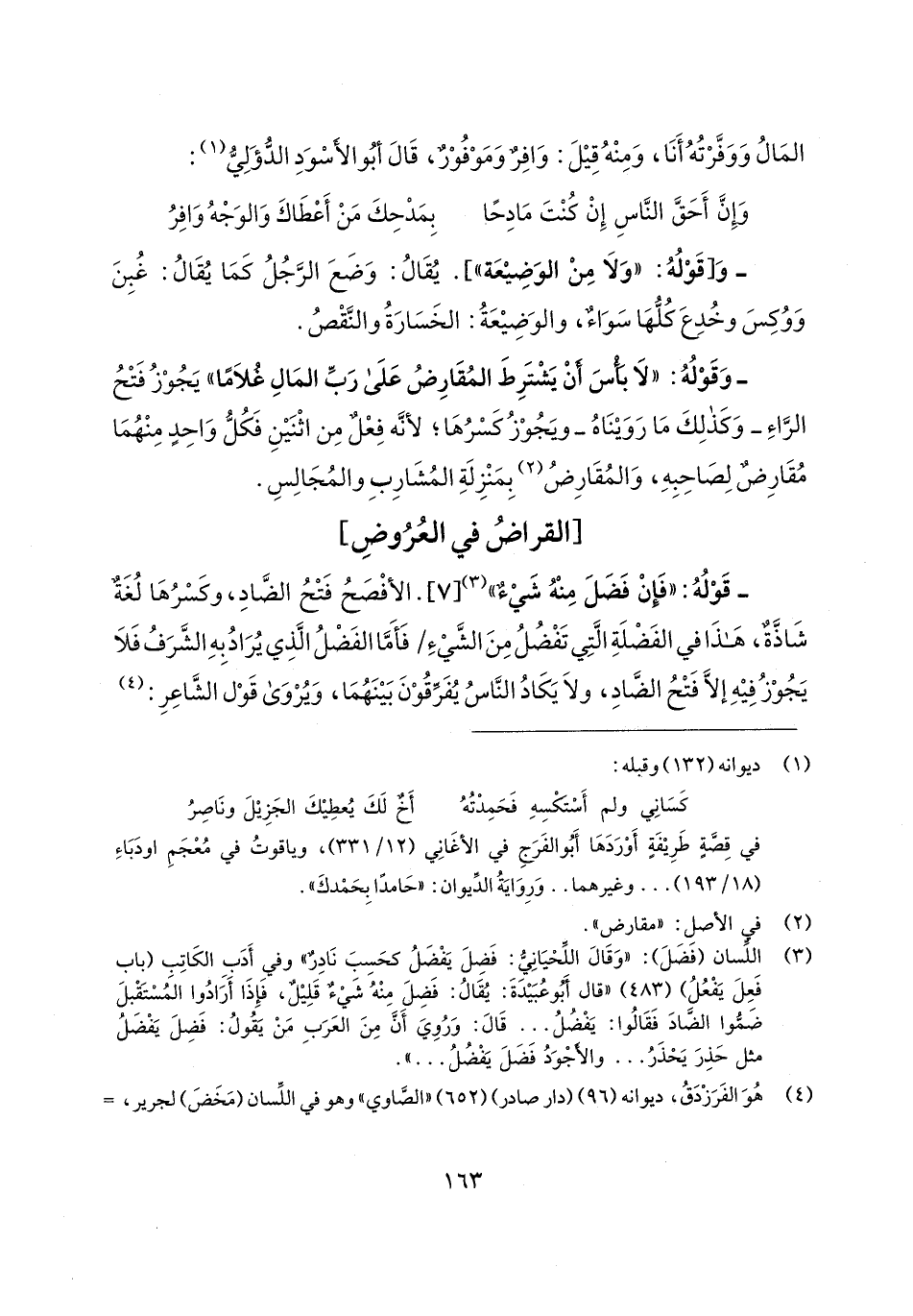 - قَوْلُهُ: "فَإنْ فَضَلَ مِنْهُ شَيءٌ" (¬3) [7]. الأفْصَحُ فَتْحُ الضَّادِ، وكَسْرُهَا لُغَةٌ شَاذَّةٌ، هَذَا في الفَضْلَةِ الَّتِي تَفْضُلُ مِنَ الشَّيءِ فَأَمَّا الفَضْلُ الَّذِي يُرَادُ بِهِ الشَّرَفُ فَلَا يَجُوْزُ فِيهِ إلَّا فَتْحُ الضَّادِ، ولا يَكَادُ النَّاسُ يُفَرِّقُوْنَ بَينَهُمَا، وَيُرْوَى قَوْل الشَّاعِرِ: (¬4)