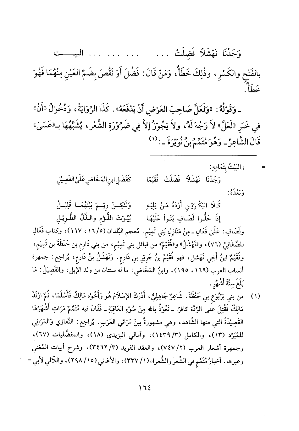 - وَقَوْلُهُ: "وَلَعَلَّ صَاحِبَ العَرْضِ أنْ يَدْفَعَهُ". كَذَا الرِّوَايَةُ، وَدُخُوْلُ "أَنْ" في خَبَرِ "لَعَلَّ" لَا وَجْهَ لَهُ، ولا يَجُوْزُ إلَّا فِي ضَرُوْرَةِ الشَّعْر، يُشَبِّهُهَا بـ"عَسَى" قَال الشَّاعِرُ -وَهُوَ مُتَمِّمُ بنُ نُوَيرَةَ-: (¬1)