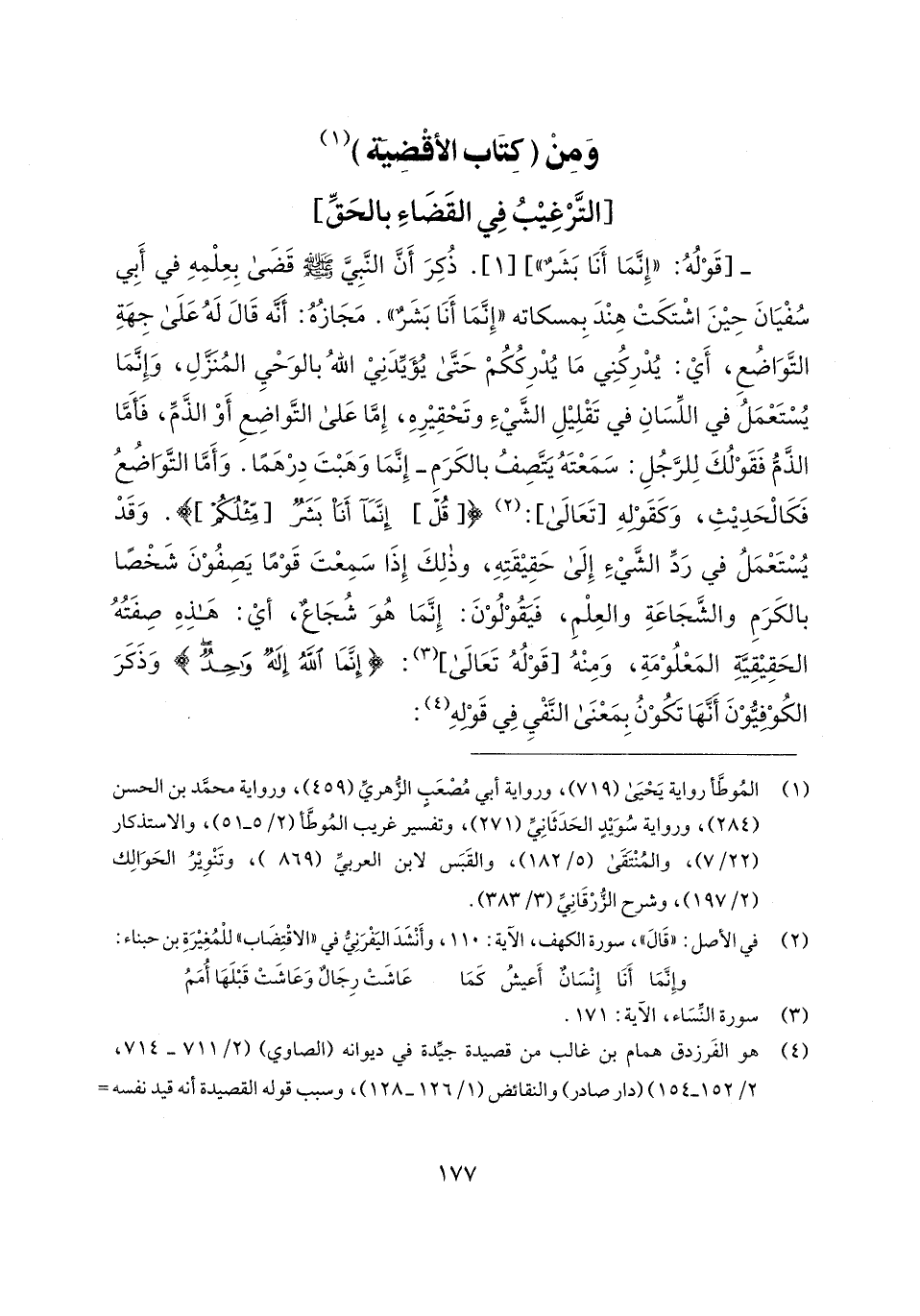 -[قَوْلُهُ: "إِنَّمَا أَنَا بَشَرٌ"] [1]. ذُكِرَ أَنَّ النَّبِيَّ - صلى الله عليه وسلم - قَضَى بِعِلْمِهِ في أَبِي سُفْيَانَ حِينَ اشْتَكَتْ هِنْدَ بِمسكاته "إِنَّمَا أَنَا بَشَرٌ". مَجَازُهُ: أَنَّه قَال لَهُ عَلَى جِهَةِ التَّوَاضُعِ، أَي: يُدْرِكُنِي مَا يُدْرِكُكُمْ حَتَّى يُؤَيِّدَنِي اللهُ بالوَحْيِ المُنَزَّلِ، وَإِنَّمَا يُسْتَعْمَلُ في اللِّسَانِ في تَقْلِيلِ الشَّيءِ وتَحْقِيرِهِ، إِمَّا عَلى التَّواضِعِ أَوْ الذَّمِّ، فَأَمَّا الذَّمُّ فَقَوْلُكَ لِلرَّجُلِ: سَمَعْتَهُ يَتَّصِفُ بالكَرَمِ -إِنَّمَا وَهَبْتَ دِرْهَمًا. وَأَمَّا التَّوَاضُعُ فَكَالْحَدِيثِ، وَكَقَوْلهِ [تَعَالى]: (¬2) {[قُلْ] إِنَّمَا أَنَا بَشَرٌ [مِثْلُكُمْ]}. وَقَدْ يُسْتَعْمَلُ في رَدِّ الشَّيءِ إِلَى حَقِيقَتِهِ، وذلِكَ إِذَا سَمِعْتَ قَوْمًا يَصِفُوْنَ شَخْصًا بالكَرَمِ والشَّجَاعَةِ والعِلْمِ، فَيَقُوْلُوْنَ: إِنَّمَا هُوَ شُجَاعٌ، أي: هَذِهِ صِفَتُهُ الحَقِيقِيَّةِ المَعْلُوْمَةِ، وَمِنْهُ [قَوْلُهُ تَعَالى] (¬3): {إِنَّمَا اللَّهُ إِلَهٌ وَاحِدٌ} وَذَكَرَ الكُوْفِيُّوْنَ أَنَّهَا تَكُوْنُ بِمَعْنَى النَّفْيِ فِي قَوْلِهِ (¬4):