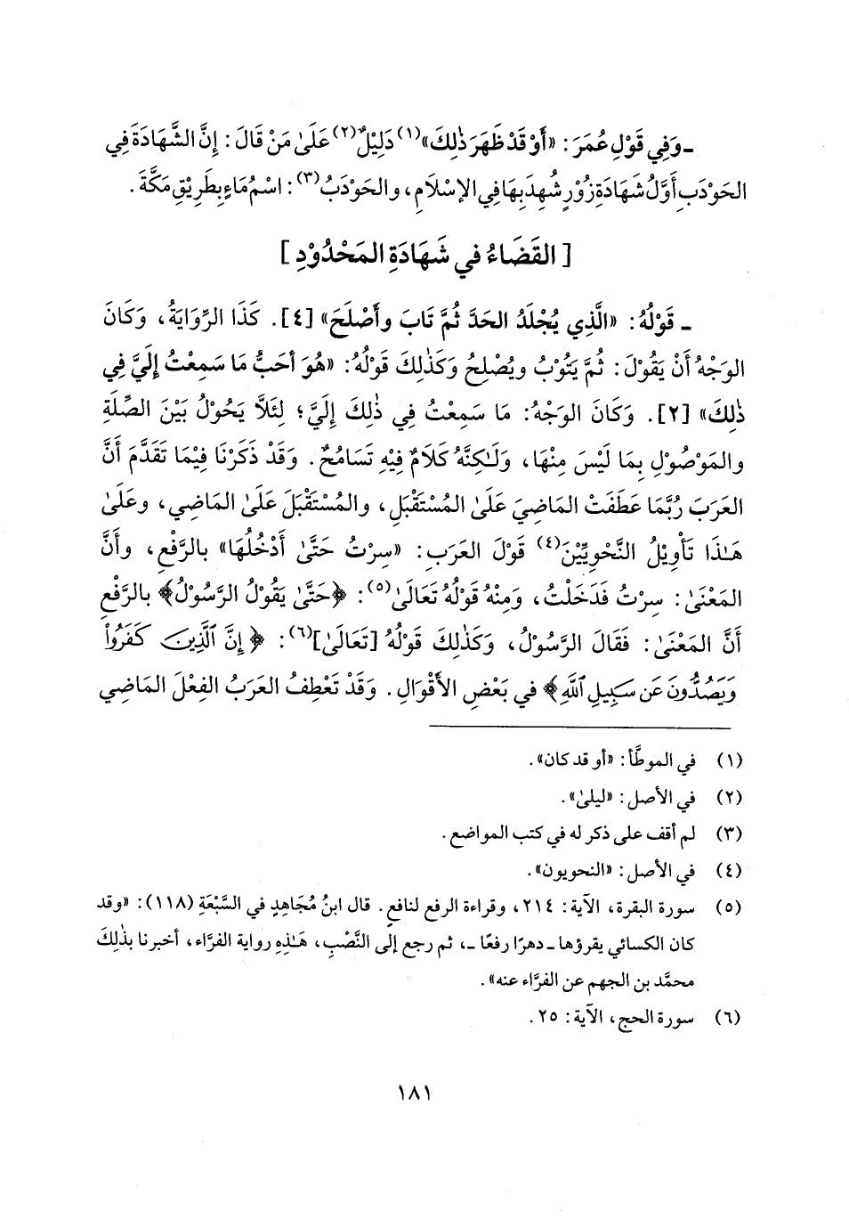 - قَوْلُهُ: "الَّذِي يُجْلَدُ الحَدَّ ثُمَّ تَابَ وأَصْلَحَ" [4]، كَذَا الرِّوَايَةُ، وَكَانَ الوَجْهُ أَنْ يَقُوْلَ: ثُمَّ يَتُوْبُ ويُصْلِحُ وَكَذلِكَ قَوْلُهُ: "هُوَ أحَبُّ مَا سَمِعْتُ إلَيَّ فِي ذلِكَ" [2]. وَكَانَ الوَجْهُ: مَا سَمِعْتُ فِي ذلِكَ إِلَيَّ؛ لِئَلَّا يَحُوْلُ بَينَ الصِّلَةِ والمَوْصُوْلِ بِمَا لَيسَ مِنْهَا، وَلكِنَّهُ كَلامٌ فِيهِ تَسَامُحٌ. وَقَدْ ذَكَرْنَا فِيمَا تَقَدَّمَ أَنَّ العَرَبَ رُبَّمَا عَطَفَتْ المَاضِيَ عَلَى المُسْتَقْبَلِ، والمُسْتَقْبَلَ عَلَى المَاضِي، وعَلَى هَذَا تَأْويلُ النَّحْويِّينَ (¬4) قَوْلَ العَرَبِ: "سِرْتُ حَتَّى أَدْخُلُهَا" بالرَّفْعِ، وأَنَّ المَعْنَى: سِرْتُ فَدَخَلْتُ، وَمِنْهُ قَوْلُهُ تَعَالى (¬5). {حَتَّى يَقُولَ الرَّسُولُ} بالرَّفْعِ أَنَّ المَعْنَى: فَقَال الرَّسُوْلُ، وَكَذلِكَ قَوْلُهُ [تَعَالى] (¬6): {إِنَّ الَّذِينَ كَفَرُوا وَيَصُدُّونَ عَنْ سَبِيلِ اللَّهِ} في بَعْضِ الأقْوَالِ. وَقَدْ تَعْطِفُ العَرَبُ الفِعْلَ المَاضِي