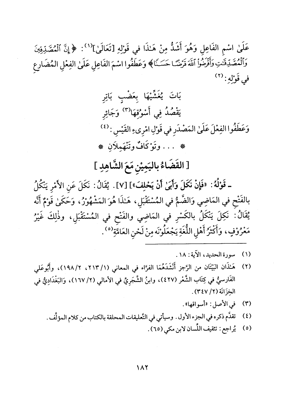عَلَى اسْمِ الفَاعِلِ وَهُوَ أَشَدُّ مِنْ هَذَا في قَوْلِهِ [تَعَالى] (¬1): {إِنَّ الْمُصَّدِّقِينَ وَالْمُصَّدِّقَاتِ وَأَقْرَضُوا اللَّهَ قَرْضًا حَسَنًا} وَعَطَفُوا اسْمَ الفَاعِلِ عَلَى الفِعْلِ المُضَارِعِ في قَوْلهِ: (¬2)