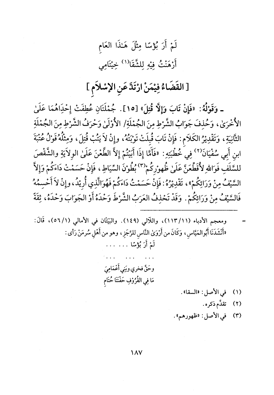 - وَقَوْلُهُ: "فَإِنْ تَابَ وَإلَّا قُتِلَ" [15]. جُمْلَتَانِ عُطِفَتْ إِحْدَاهُمَا عَلَى الأُخْرَى، وَحُذِفَ جَوَابُ الشَّرْطِ مِنَ الجُمْلَةِ الأوْلَى وَحْرَفُ الشَّرْطِ مِنَ الجُمْلَةِ الثَّانِيَةِ، وَتَقْدِيرُ الكَلامِ: فَإِنْ تَابَ قُبِلَتْ تَوْبَتُهُ، وإِنْ لَا يَتُبْ قُتِلَ، وَمِثْلُهُ قَوْلُ عُتْبَةَ بنِ أَبِي سُفْيَانَ (¬2) فِي خُطْبَتِهِ: "فَأمَّا إِذَا أَبَيتُمْ إِلَّا الطَّعْنَ عَلَى الولايَةِ والشَّقْصَ للسَّلَفِ فَوَاللهِ لأقَطِّعَنَّ عَلَى ظُهوْرِكُمْ (¬3) بُطُوْنَ السِّيَاطِ، فَإِنْ حَسَمْتْ دَاءَكُمْ وَإِلَّا السَّيفُ مِنْ وَرَائِكُمْ"، تَقْدِيرُهُ: فَإِنْ حَسَمْتُ دَاءَكُمْ فَهُوَ الَّذِي أُرِيدُ، وإِنْ لَا أَحْسِمُهُ فَالسَّيفُ مِنْ وَرَائِكُمْ. وَقَدْ تَحْذِفُ العَرَبُ الشَّرْطَ وَحْدَهُ أَوْ الجَوَابَ وَحْدَهُ، ثِقَةً