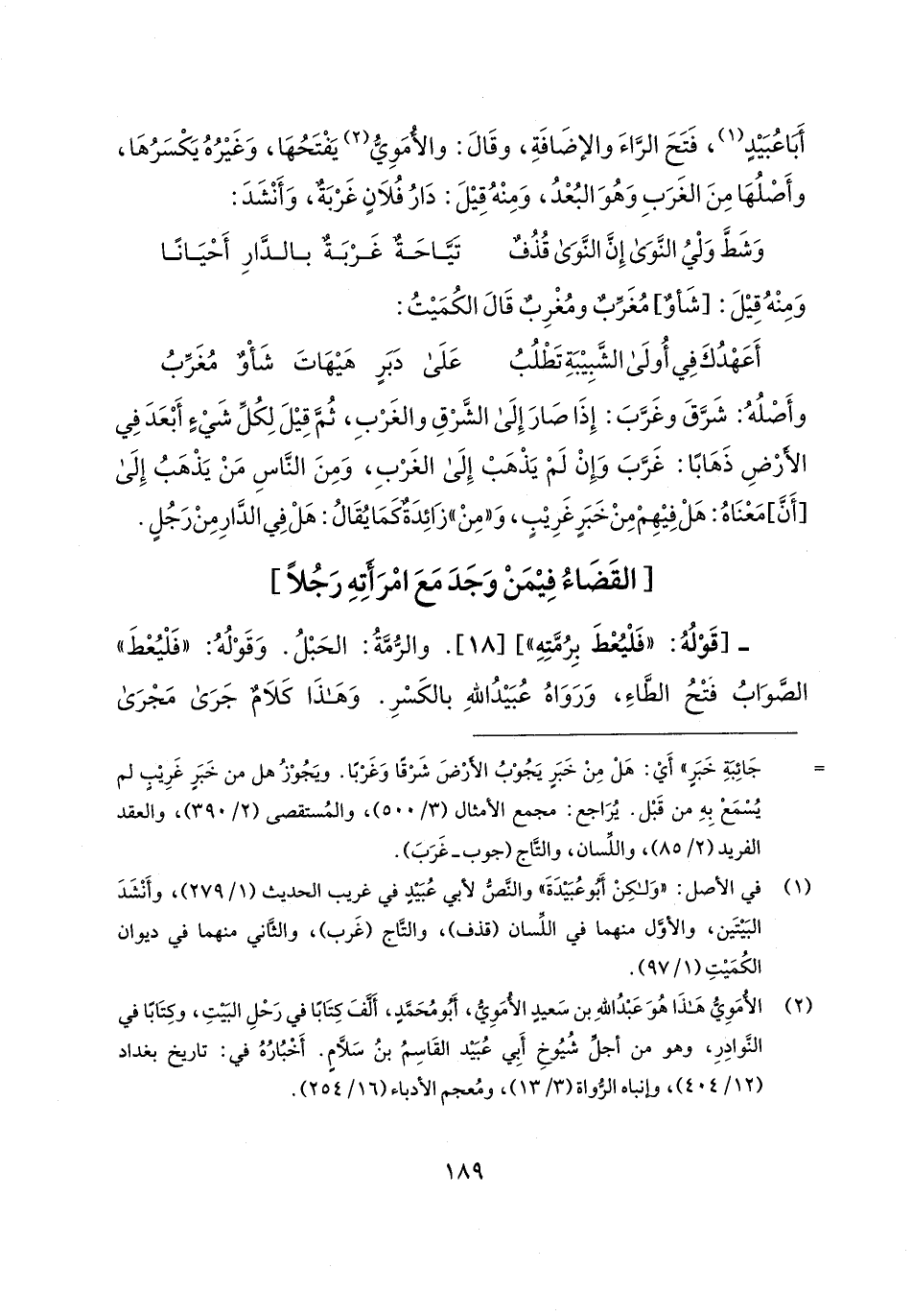 (¬2) الأُمَويُّ هَذَا هُوَ عَبْدُ اللهِ بن سَعيدٍ الأمَويُّ، أَبُو مُحَمَّدٍ، ألَّفَ كِتَابًا في رَحْلِ البَيتِ، وكِتَابًا في النَّوادِرِ، وهو من أجلِّ شُيُوخِ أَبِي عُبَيد القَاسِمُ بنُ سَلَّامٍ. أَخْبُارُهُ في: تاريخ بغداد (12/ 404)، وإنباه الرُّواة (3/ 13)، ومُعجم الأدباء (16/ 254).