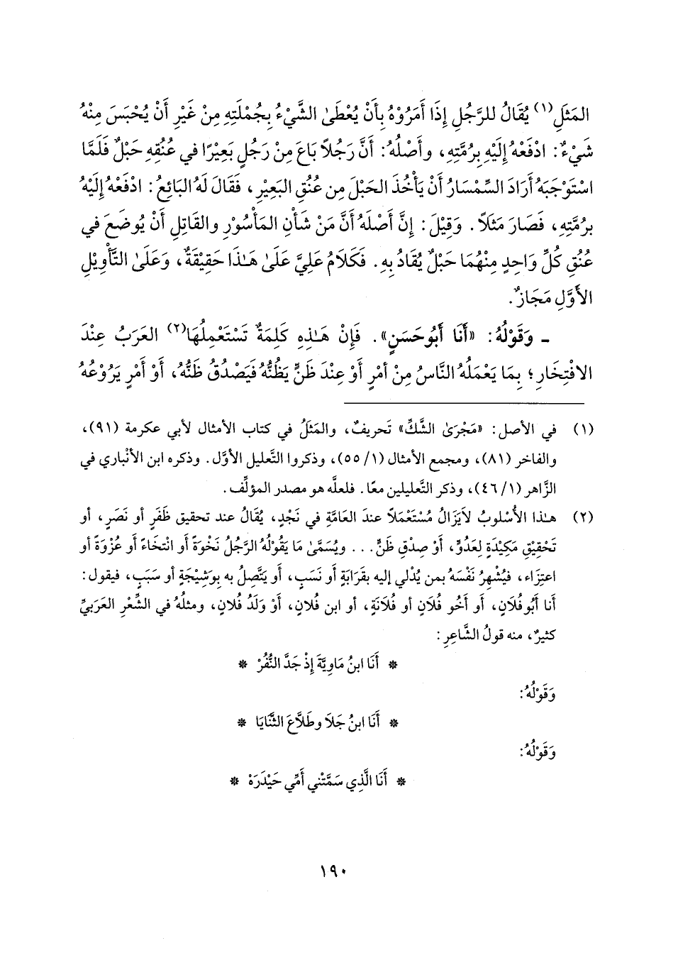 (¬2) هذا الأُسْلوبُ لَا يَزَالُ مُسْتَعْمَلًا عندَ العَامَّةِ في نَجْدٍ، يُقَالُ عند تحقيق ظَفَرٍ أو نَصَرٍ، أو تَحْقِيقِ مَكِيدَة لِعَدُوٍّ، أَوْ صِدْقِ ظَنٍّ ... ويُسَمَّى مَا يَقُوْلُهُ الرَّجُلُ نَخْوَةً أَو انْتخَاءً أَو عُزْوَةً أو اعتِزَاء، فيُشْهِرُ نَفْسَهُ بمن يُدْلي إليه بقَرَابَةٍ أَو نَسَبٍ، أَو يَتَّصِلُ به بِوَشِيجَةٍ أو سَبَبٍ، فيقول: أَنا أَبُو فُلانٍ، أَو أَخُو فُلانٍ أو فُلانَةٍ، أو ابن فُلانٍ، أَوْ وَلَدُ فُلانٍ، ومثلُهُ في الشِّعْرِ العَرَبيِّ كثيرٌ، منه قولُ الشَّاعِرِ: