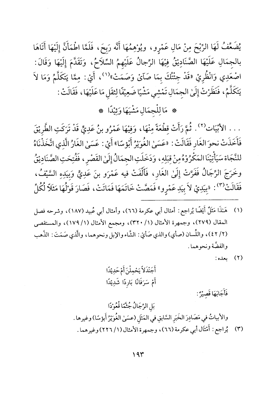 ... الأبْيَات (¬2). ثُمَّ رَأَتْ قِطْعَةً مِنْهَا، وَفِيهَا عَمْرُو بنُ عَدِيٍّ قَدْ تَرَكَتِ الطَّرِيقَ فَأَخَذَتْ نحوَ الغَارِ فَقَالتْ: "عَسَى الغُوَيرُ أَبْؤسًا" أَي: عَسَى الغَارُ الَّذِي اتَّخَذْنَاهُ للنَّجَاة سَيَأْتِينَا المَكْرُوْهُ مِنْ قِبَلِهِ، وَدَخَلَتِ الجِمَالُ إِلَى القَصْرِ، فَفُتِحَتِ الصَّنَادِيقُ وخَرَجَ الرِّجَالُ فَفَرَّتْ إِلَى الغَارِ، فَأَلْفَتْ فيه عَمْرَو بنَ عَدِيٍّ وَبِيَدِهِ السَّيفُ، فَقَالتْ (¬3): "بِيَدِي لَا بِيَدِ عَمْرٍو" فَمَصَّتْ خَاتَمَهَا فَمَاتَتْ، فَصَارَ قَوْلُهَا مَثَلًا لُكُلِّ