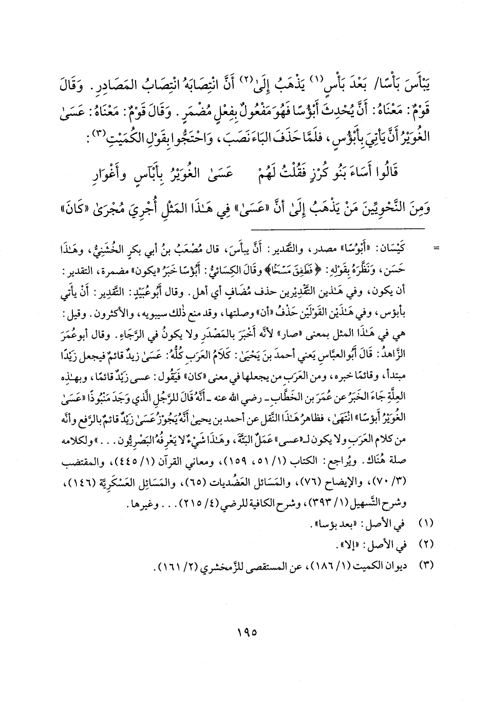 يَبْأسَ بَأْسًا بَعْدَ بَأسٍ (¬1) يَذْهَبُ إِلَى (¬2) أَنَّ انْتِصَابَهُ انْتِصَابُ المَصَادِرِ. وَقَال قَوْمٌ: مَعْنَاهُ: أَنَّ يُحْدِثَ أَبْؤُسًا فَهُوَ مَفْعُولٌ بِفِعْلٍ مُضْمَرٍ. وَقَال قَوْمٌ: مَعْنَاهُ: عَسَى الغُوَيرُ أَنَّ يَأتِيَ بِأَبْؤُسٍ، فلَمَّا حَذَفَ البَاءَ نَصَبَ، وَاحْتَجُّوا بِقَوْلِ الكُمَيتِ (¬3):