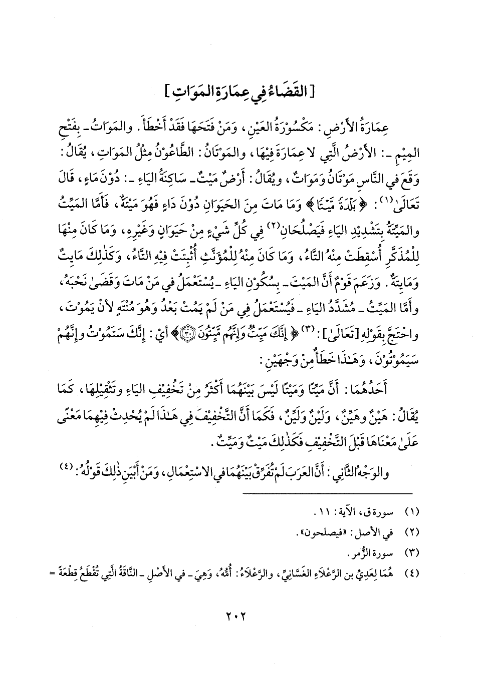 عِمَارَةُ الأَرْضِ: مَكْسُوْرَةُ العَينِ، وَمَنْ فَتَحَهَا فَقَدْ أَخْطَأَ. والمَوَاتُ - بِفَتْحِ المِيمِ -: الأَرْضُ الَّتِي لا عِمَارَةَ فِيهَا، والمَوْتَانُ: الطَّاعُوْنُ مِثْلُ المَوَاتِ، يُقَالُ: وَقَعَ في النَّاسِ مَوْتَانُ وَمَوَاتٌ، ويُقَالُ: أَرْضٌ مَيتٌ - سَاكِنَةُ اليَاءِ -: دُوْنَ مَاءٍ، قَال تَعَالى (¬1): {بَلْدَةً مَيتًا} وَمَا مَاتَ مِنَ الحَيَوَانِ دُوْنَ دَاءِ فَهُوَ مَيتة، فَأَمَّا المَيِّتُ والمَيِّتَةُ بِتَشْدِيدِ اليَاءِ فَيَصْلُحَانِ (¬2) فِي كُلِّ شَيءٍ مِنْ حَيَوَانٍ وَغَيرِهِ، وَمَا كَانَ مِنْهَا لِلْمُذَكَّرِ أُسْقِطَتْ مِنْهُ التَّاءُ، وَمَا كَانَ مِنْهُ لِلْمُؤَنَّثِ أُثْبِتَتْ فِيهِ التَّاءُ، وَكَذلِكَ مَايِتٌ وَمَايِتَةٌ. وَزَعَمَ قَوْمٌ أَنَّ المَيتَ - بِسُكُوْنِ اليَاءِ - يُسْتَعْمَلُ في مَنْ مَاتَ وَقَضَى نَحْبَهُ، وأَمَّا المَيِّتُ - مُشَدَّدُ اليَاءِ - فَيُسْتَعْمَلُ فِي مَنْ لَمْ يَمُتْ بَعْدُ وَهُوَ مُنْتَهٍ لأنْ يَمُوْتَ، واحْتَجَّ بِقَوْلِهِ [تَعَالى]: (¬3) {إِنَّكَ مَيِّتٌ وَإِنَّهُمْ مَيِّتُونَ} أي: إِنَّكَ سَتَمُوْتُ وإِنَّهُمْ سَيَمُوْتُوْنَ، وَهَذَا خَطَأٌ مِنْ وَجْهَينِ: