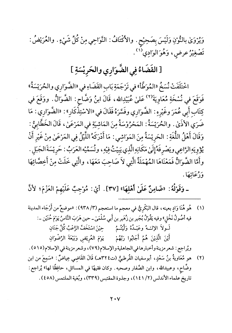 اخْتَلَفَتْ نُسَخُ "المُوَطَّأ" في تَرْجَمَةِ بَابِ القَضَاءِ في "الضَّوَارِي والحُرَيسَةُ" فَوَقَعَ في نُسْخَةِ مُعَاويَةَ (¬2) عَلى عُبَيدِ الله، قَال ابنُ وَضَّاح: الضَّوَالُّ. ووَقَعَ في كِتَابِ أَبِي عُمَرَ وغَيرِهِ: الضَّوَارِي وفَسَّرَهُ فَقَال في "الاسْتِذْكَارِ": "الضَّوَارِي: مَا ضَرَي الأذَى. والحُرَيسَةُ: المَحْرُوْسَةُ مِنَ المَاشِيَةِ في المَرْعَى، قَال الخَطَّابِيُّ: وَقَال أَهْلُ اللُّغَةِ: الحَرِيسَةُ مِنَ المَوَاشِي: مَا أَدْرَكَهُ اللَّيلُ فِي المَرْعَى مِنْ غَيرِ أَنْ يُؤْويَهِ الرَّاعِي ويَصْرِفَهُ إِلَى مَكَانِهِ الَّذِي يَبِيتُ فِيهِ، وتُسَمِّيه العَرَبُ: حَرِيسَةَ الجَبَلِ. وأَمَّا الضَّوَالُّ فَمَعْنَاهَا المُهْمَلَةُ الَّتِي لَا صَاحِبَ مَعَهَا، والَّتِي خَلَتْ مِنْ أَخِصَّائِهَا وَرُعَاتِهَا.