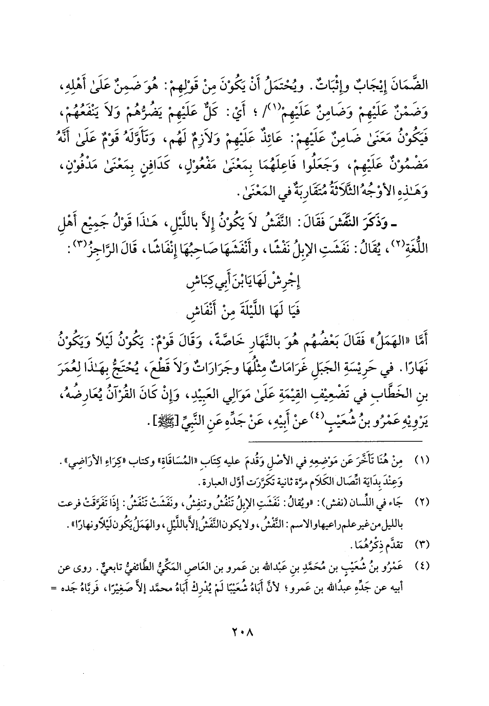 - وَذَكَرَ النَّفَشَ فَقَال: النَّفَشُ لَا يَكُوْنُ إِلَّا باللَّيلِ، هَذَا قَوْلُ جَمِيعْ أَهْلِ اللُّغَةِ (¬2)، يُقَالُ: نَفَشَتِ الإبِلُ نَفْشًا، وأَنْفَشَهَا صَاحِبُهَا إِنْفَاشًا، قَال الرَّاجِزُ (¬3):