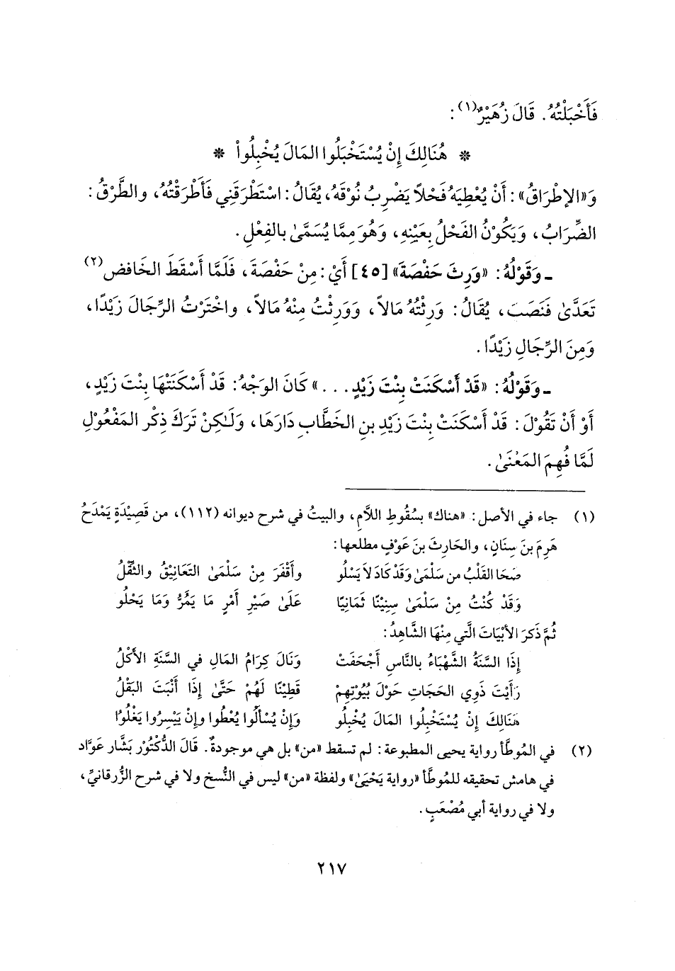 - وَقَوْلُهُ: "قَدْ أسْكَنَتْ بِنْتَ زَيدٍ ... " كَانَ الوَجْهُ: قَدْ أَسْكَنَتْهَا بِنْتَ زَيدٍ، أَوْ أَنْ تَقُوْلَ: قَدْ أَسْكَنَتْ بِنْتَ زَيدِ بنِ الخَطَّابِ دَارَهَا، وَلكِنْ تَرَكَ ذِكْر المَفْعُوْلِ لَمَّا فُهِمَ المَغنَى.