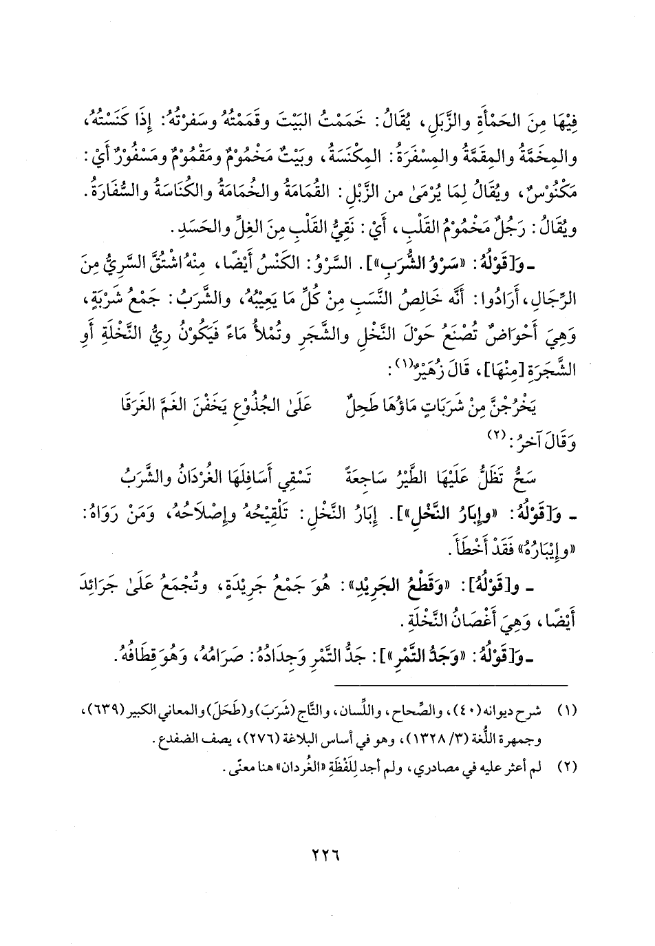 - و [قَوْلُهُ]: "وَقَطْعُ الجَرِيدِ": هُوَ جَمْعُ جَرِيدَةٍ، وتُجْمَعُ عَلَى جَرَائِدَ أَيضًا، وَهِيَ أَغْصَانُ النَّخْلَةِ.