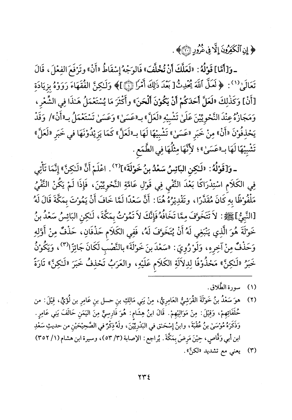 - وَ [قَوْلُهُ: "لكِنِ البَائِسُ سَعْدُ بنُ خَوْلَةَ"] (¬2). اعْلَمْ أَنَّ "لكِنَّ" إِنَّمَا تَأْتِي فِي الكَلامِ اسْتِدْرَاكًا بَعْدَ النَّفْيِ فِي قَوْلِ عَامَّةِ النَّحْويِّينَ، فَإِذَا لَمْ يَكُنْ النَّفْيُ مَلْفُوْظًا بِهِ كَانَ مُقَدَّرًا، وتَقْدِيرُهُ هُنَا: أَنَّ سَعْدًا لَمَّا خَافَ أَنْ يَمُوْتَ بِمَكَّةَ قَال لَهُ [النَّبِيُّ]- صلى الله عليه وسلم -: لَا تَتَخَوَّفَ مِمَّا تَخَافُهُ فَإِنَّكَ لَا تَمُوْتُ بِمَكَّةَ، لكِنِ البَائِسُ سَعْدُ بنُ خَوْلَةَ هُوَ الَّذِي يَنْبَغِي لَهُ أَنْ يُتَخَوَّفَ لَهُ، فَفِي الكَلامِ حَذْفَانِ، حَدفٌ مِنْ أَوَّلِهِ وَحَذْفٌ مِنْ آخِرِهِ، وَلَوْ رُويَ: "سَعْدَ بنَ خَوْلَةَ" بالنَّصْبِ لَكَانَ جَائِزًا (¬3)، وَيَكُوْنُ خَبَرُ "لَكِنَّ" مَحْذُوْفًا لِدِلالةِ الكَلامِ عَلَيهِ، والعَرَبُ تَحْذِفُ خَبَرَ "لَكِنَّ" تَارَةً