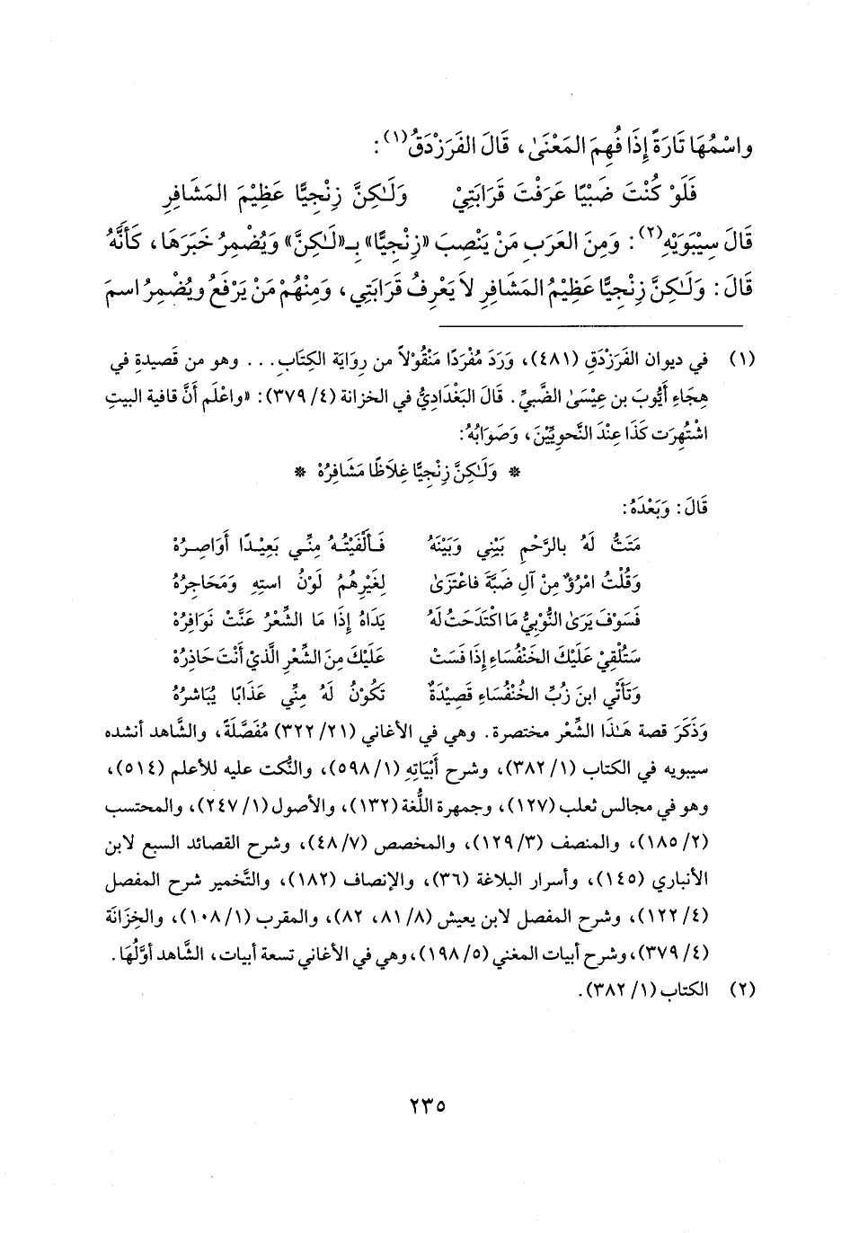 (¬1) في ديوان الفَرَزْدَقِ (481)، وَرَدَ مُفْرَدًا مَنْقُوْلًا من رِوَايَة الكِتَابِ ... وهو من قَصيدةِ في هِجَاءِ أَيُّوبَ بن عِيسَى الضَّبيِّ. قَال البَغْدَادِيُّ في الخزانة (4/ 379): "واعْلَم أَنَّ قافية البيتِ اشْتُهِرَت كَذَا عِنْدَ النَّحويِّينَ، وَصَوَابُهُ: