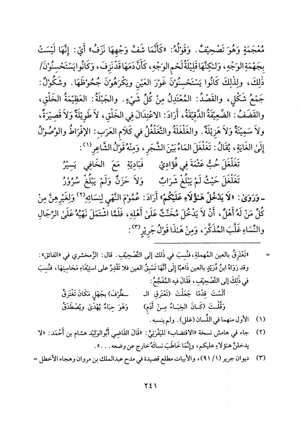 مُعْجَمَةٍ وَهُوَ تَصْحِيفٌ. وَقَوْلُهُ: "كَأَنَّمَا شَفَّ وَجْهِهَا نزَفُ" أَي: إِنَّهَا لَيسَتْ بِجَهْمَةِ الوَجْهِ، وَلكِنَّهَا قَلِيلَةُ لَحْمِ الوَجْهِ، كَأَنَّ دَمَهَا قَدْ نَزِفَ، وَكَانُوا يَسْتَحْسِنُوْنَ ذلِكَ، ولِذلِكَ كَانُوا يَسْتَحْسِنُوْنَ غَوْرَ العَينِ ويَكْرَهُوْنَ جُحُوْطهَا. وشَكُوْلٌ: جَمْعُ شَكْل، والقَصْدُ: المُعْتَدِلُ مِنْ كُلِّ شَيءٍ. والجَبْلَةُ: العَظِيمَةُ الخَلْقِ، والقَضَفُ: الضعِيفَةُ الدَّقِيقَةُ، أَرَادَ: الاعْتِدَال فِي الخَلْقِ، لَا طَويلَةٌ وَلَا قَصِيرَةٌ، ولَا سَمِينَةٌ وَلَا هَزِيلَةٌ. والغَلْغَلَةُ والتَّغَلْغُلُ في كَلَامِ العَرَبِ: الإفْرَاطُ والوُصُوْلُ إِلَى الغَايَةِ، يُقَالُ: تَغَلْغَلَ المَاءُ بَينَ الشَّجَرِ، وَمِنْهُ قَوْلُ الشَّاعِرِ (¬1):