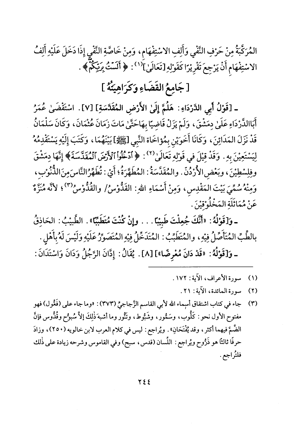 -[قَوْلُ أَبِي الدَّرْدَاءِ: هَلُمَّ إِلَى الأَرْضِ المُقَدَّسَةِ] [7]. اسْتَقْضَى عُمَرُ أَبا الدَّرْدَاءِ عَلَى دِمشْقَ، وَلَمْ يَزَلْ قَاضِيًا بِهَا حَتَّى مَاتَ زَمَانَ عُثْمَانَ، وَكَانَ سَلْمَانُ قَدْ نزَلَ المَدَائِنَ، وَكَانَا أَخَوَينِ بِمُؤاخَاة النَّبِي [- صلى الله عليه وسلم -] بَينَهُمَا، وَكَتَبَ إِلَيهِ يَسْتَقْدِمُهُ لِيَسْتَعِينَ بِهِ. وَقَدْ قِيلَ في قَوْلهِ تَعَالى (¬2): {ادْخُلُوا الْأَرْضَ الْمُقَدَّسَةَ} إِنَّهَا دِمَشْقَ وفِلِسْطِينَ، وبَعْضِ الأُرْدُنّ. والمُقَدَّسَةُ: المُطَهَّرَةُ؛ أَي: تُطَهِّرُ النَّاسَ مِنَ الدُّنُوْبِ، وَمِنْهُ سُمِّيَ بَيتَ المَقْدِسِ، وَمِنْ أَسْمَاءِ اللهِ: القَدُّوْسُ والقُدُّوْسُ (¬3)؛ لأنَّه مُنَزَّهٌ عَنْ مُمَاثَلَةِ المَخْلُوْقِينَ.