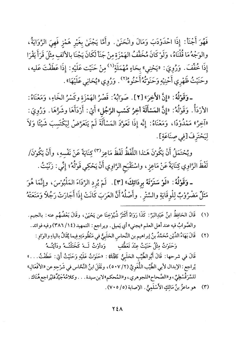 قَال في شرحها: قَال أَبُو الطَّيِّب الحَلَبِيُّ رحمه اللهُ: "حَنَوْتُ عَلَيهِ وَحَنَيتُ أَي: عَطَفْتُ ... " يُراجع: الإبدال لأبي الطَّيِّب اللُّغَويِّ (2/ 507)، ونَقَلَ ابنُ النَّحَّاس في شَرْحِهِ عن "الأفْعالِ" للسَّرَقُسْطِيِّ، و"الصَّحاح" للجوهري، و"المُحكم" لا بن سيدة ... وكلامُهُ جَيِّدٌ فليُراجع هُنَاك.