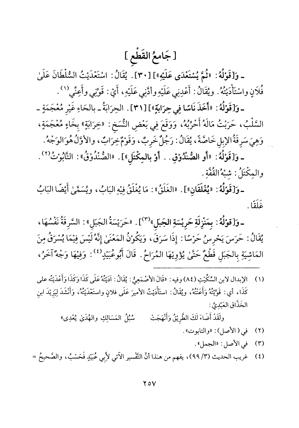 - وَ [قَوْلُهُ: "أَخَذَ نَاسًا فِي حِرَابَةٍ"] [31]. الحِرَابَةُ -بالحَاءِ غَيرِ مُعْجَمَةٍ- السَّلْبُ، حَرَبْتُ مَالهُ أَحْرُبُهُ، وَوَقَعَ فِي بَعْضِ النُّسَخِ: "خِرَابَةٍ" بِخَاءٍ مُعْجَمَةٍ، وَهِيَ سَرِقَةُ الإِبِلِ خَاصَّة، يُقَالُ: رَجُلٌ خَرِبٌ، وَقَوْمٌ خِرَابٌ، والأوَّلُ هُوَ الوَجْهُ.
